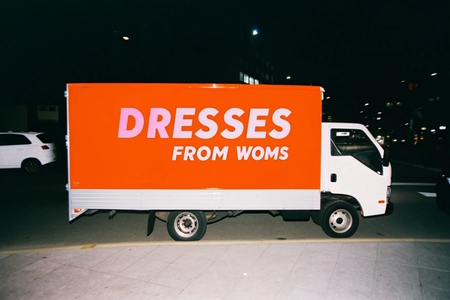 /imagine prompt: a truck on the side of which it is written that inside there are dresses from a women’s brand woms, everything is written in reiseburo font