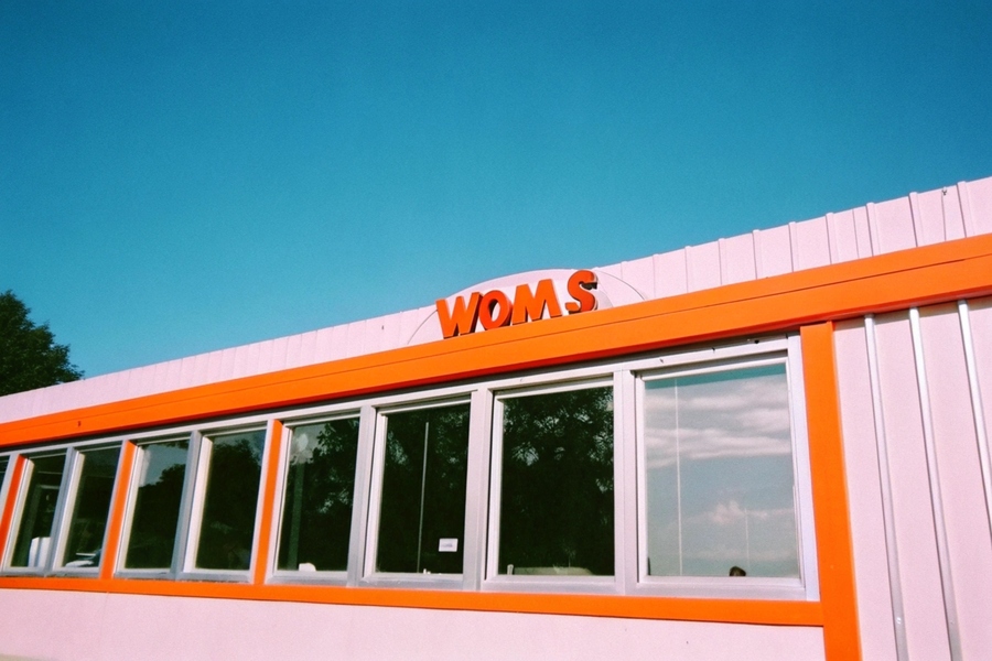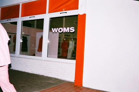 /imagine prompt: the building of a women’s clothing store, floor-to-ceiling windows and a sign with the brand name woms, the building, everything fits into the frame and is clearly visible