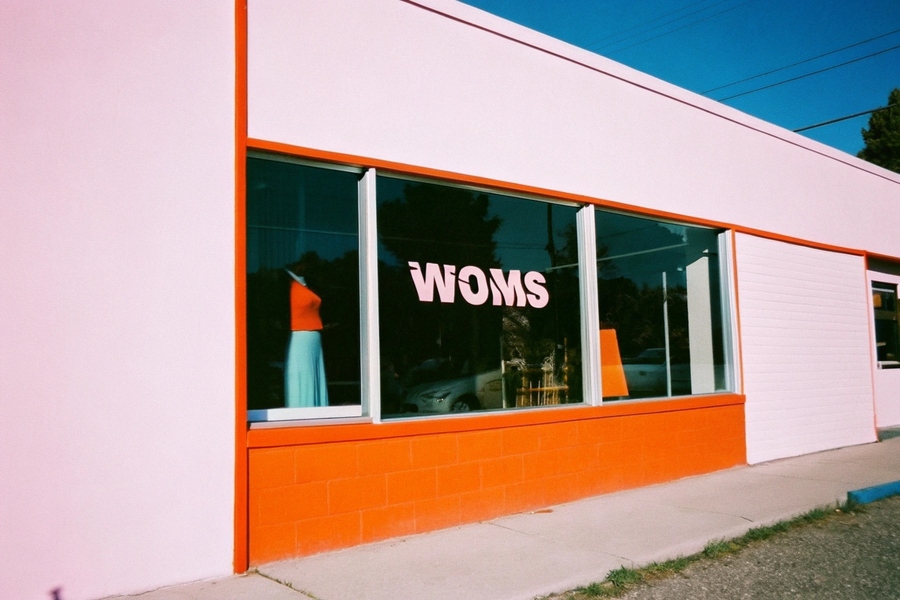 /imagine prompt: store exterior (outside space) for women’s clothing brand woms, standard glass and dresses visible inside
