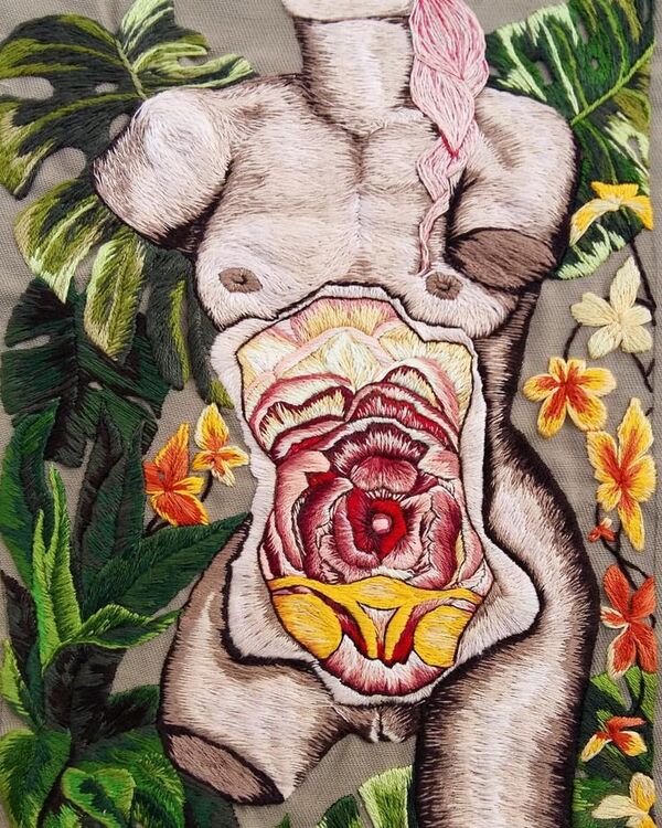 Орли Коган создает работы натягивая текстиль на раму. Вышивка здесь иллюстрирует разных женщин, отсылая к основным идеям феминистского искусства: бодипозитив, сестринство, право голоса женщины, связь с природой, знаменитые женщины в мировой истории.