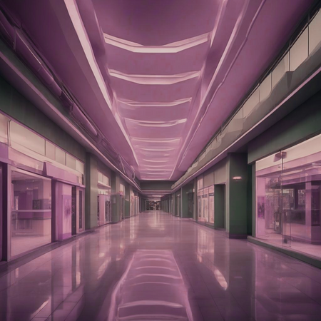 An eerie, surreal shopping mall interior, featuring empty corridors and dim, shadowy lighting that creates a foreboding atmosphere. The architecture is a blend of modern and retro styles, with unusual angles and unsettling reflections. Dreamlike elements such as floating objects and distorted perspectives are present.