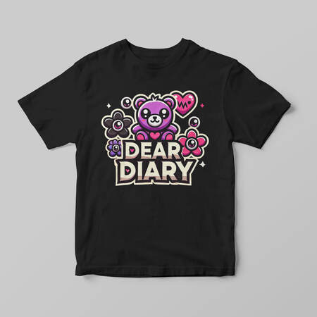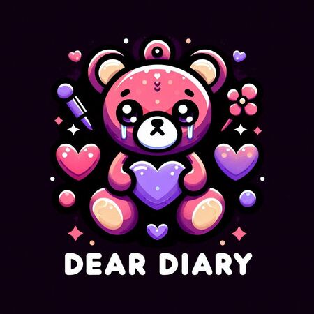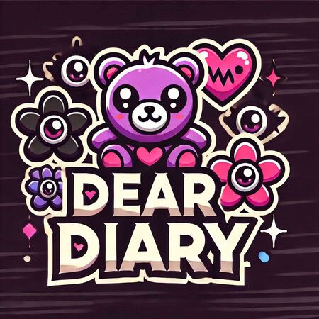 Logo design for a video game titled ’Dear Diary.’ The logo should feature playful yet slightly dark elements that reflect the game’s theme of a girl fighting her emotions. Incorporate imagery of cute yet eerie elements like plush teddy bears, heart-shaped eyes, and flower characters with eyes.