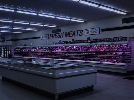 Stable Diffusion снова не очень хорошо справился с формами и деталям, но идеально передал атмосферу и подобрал гармоничное освещение, палитру для продуктов на полках.