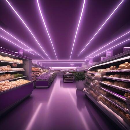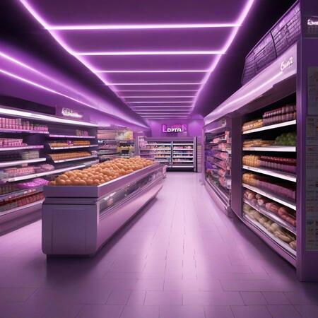 Concept art of a supermarket located in a shopping mall, designed in the style of liminal spaces and dreamcore aesthetics. The environment is enveloped in dim, flickering purple lights that cast long shadows, creating a foreboding and mysterious atmosphere. Include elements like distorted aisles that seem to stretch into darkness, surreal product displays that feel out of place, and unsettling reflections in glass surfaces that evoke a sense of dread.