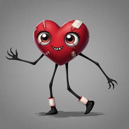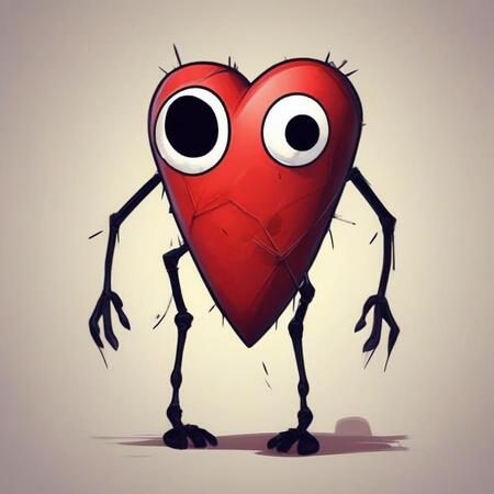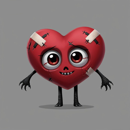 Additionally, the heart should have subtle imperfections, such as uneven edges or a faint, eerie smile that hints at something sinister beneath its cute facade. The overall design should embrace minimalism while incorporating elements of horror, resulting in an endearing yet disconcerting character that embodies both sweetness and a hint of menace.