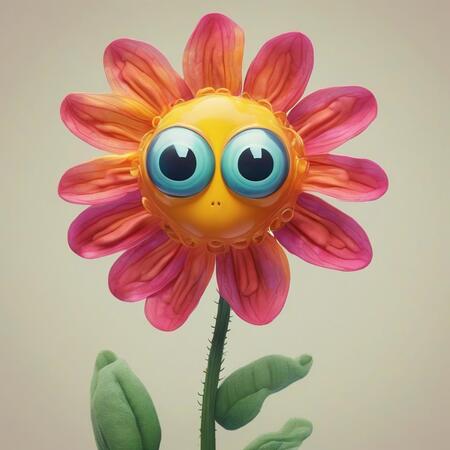 A vibrant flower character with oversized, expressive eyes that convey a mix of charm and unease. The flower should have vivid, colorful petals that are beautifully shaped but feature subtle irregularities, giving it an unsettling twist. Its stem should be thin and slightly twisted, adding an eerie contrast to its cheerful appearance.