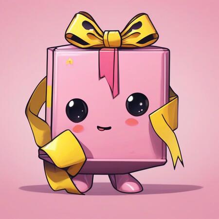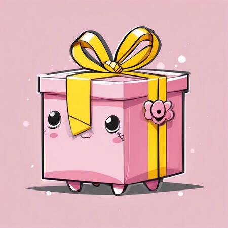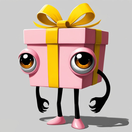A cute gift box in a soft pink color with a large yellow bow on top and oversized, expressive eyes that convey a mix of charm and unease. The box should have a simple design with minimal patterns, while its thin black arms and legs add an unsettling contrast to its adorable appearance.