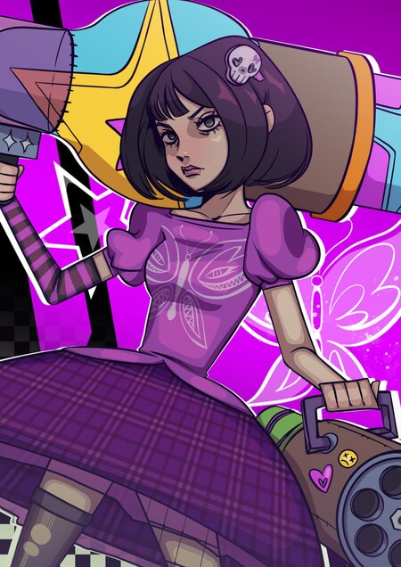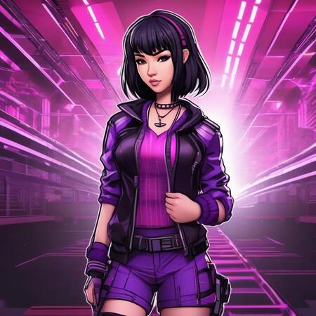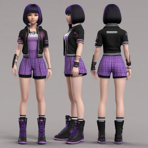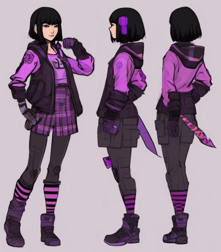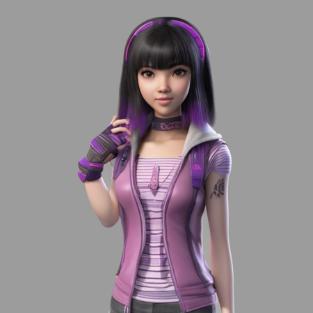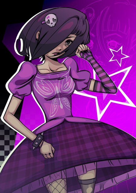 Art of the main character for a dynamic shooter game. The character is a teenage girl with light skin and subtle Asian features. She has short dark hair with bangs, embodying an emo style in her clothing. Her outfit incorporates a mix of purple, pink, and black colors, featuring striped and checkered patterns that reflect her unique personality.