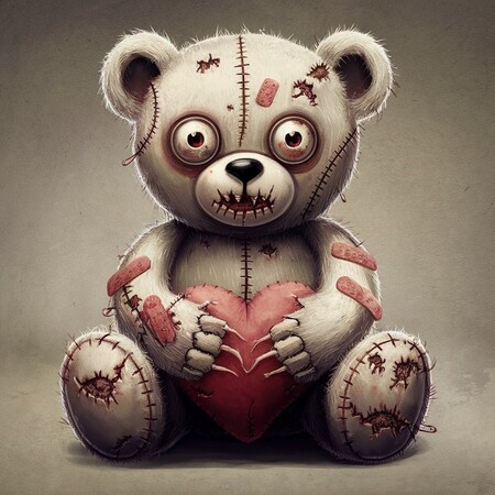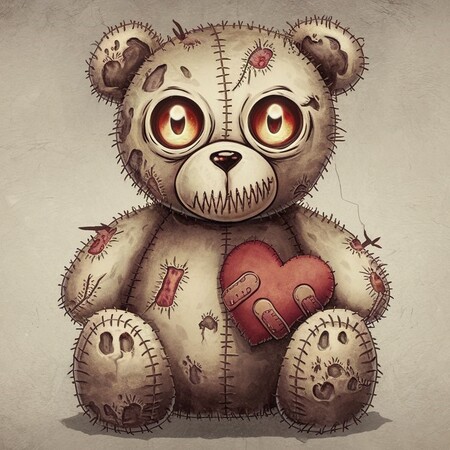 Band-aids should be scattered across its body, alongside frayed edges and ragged limbs to emphasize its dilapidated state. In its hands, it clutches a plush heart, which adds a juxtaposition of cuteness against its sinister presence. The overall design should blend minimalism with elements of horror, creating an unsettling yet adorable character that embodies the duality of childhood fears and nostalgia.