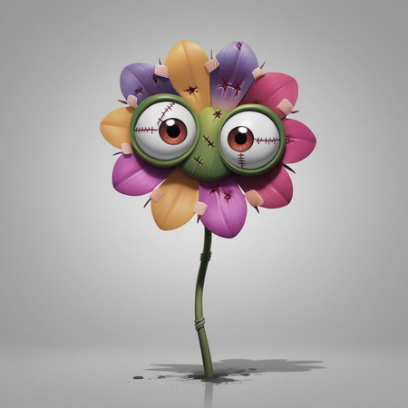 The flower’s surface should include visible stitches and band-aids, enhancing its quirky and slightly damaged look. Additionally, the flower should have imperfections like uneven petal edges or a faint, unsettling smile that hints at something sinister beneath its bright facade. The overall design should embrace minimalism while incorporating elements of horror, resulting in an enchanting yet disconcerting character that embodies both beauty and a hint of menace.