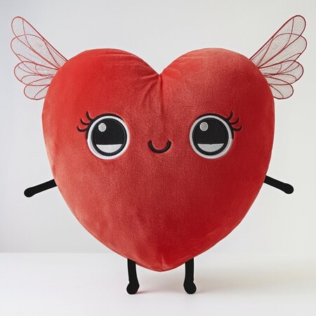 Additionally, the heart should have delicate wings on its back, enhancing its adorable appearance. The overall color palette should be soft and inviting, emphasizing the plush texture of the toy. The background should be pure white to highlight the character of the plush heart.