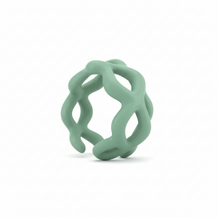 2 — organic branching ring, lattice-like structure, intertwined tubular forms wrapping around the finger, biomorphic design, matte pastel green, soft lighting, modern jewelry render, white background