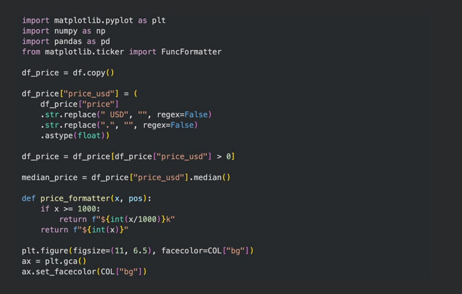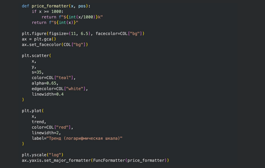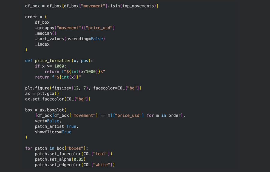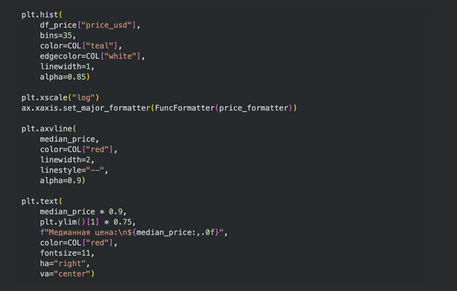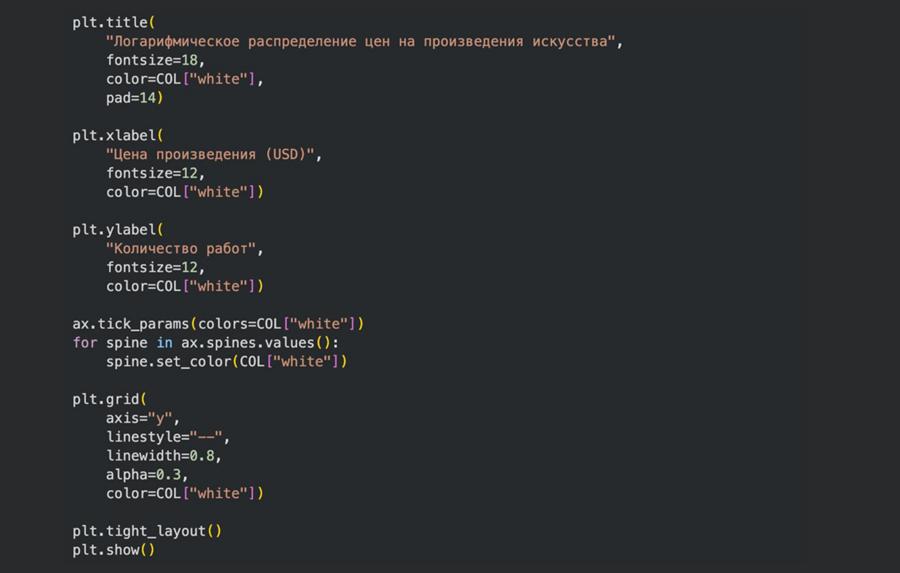 • Анализ распределений с логарифмическим масштабированием — использовался для исследования распределения цен на произведения искусства. Применение логарифмической шкалы позволило корректно визуализировать данные с сильной асимметрией и длинным «хвостом» высоких цен, а также выявить типичную медианную стоимость работ.