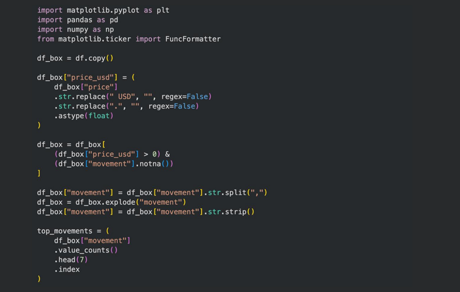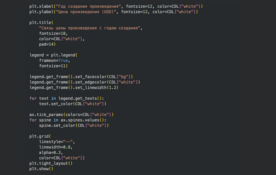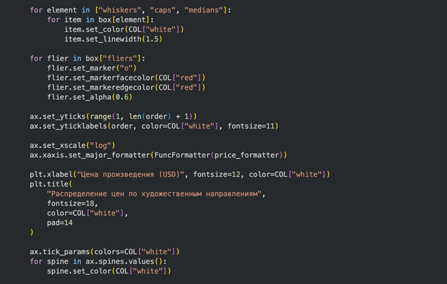 • Описательная статистика (медиана) — применялась для расчёта центральной тенденции цен, что позволило получить устойчивую оценку «типичной» стоимости произведений, менее чувствительную к экстремально дорогим объектам.