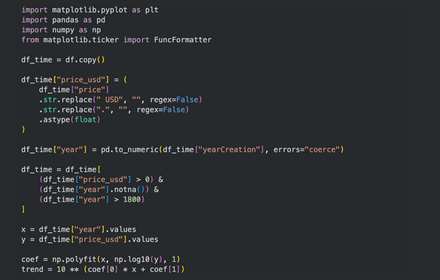 • Корреляционно-регрессионный анализ во временном разрезе — применялся для изучения связи между годом создания произведения и его ценой. Линейная регрессия в логарифмическом пространстве позволила выявить общий долгосрочный тренд роста стоимости работ в зависимости от исторического периода.