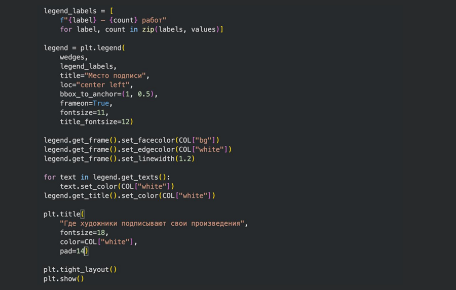 • Частотный анализ категориальных признаков — использовался для исследования расположения подписи художника на произведении. Подсчёт частот и визуализация долей категорий позволили выявить наиболее распространённые и наименее типичные места подписи.
