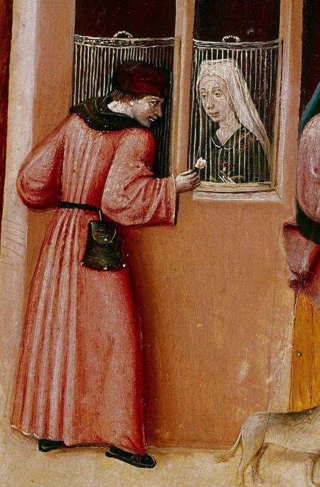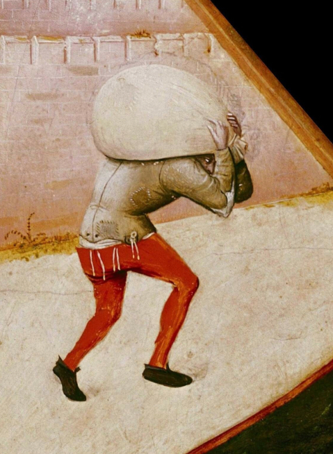 Девушка слева засмотрелась на большой кошелек мужчины, а он не может оторвать глаз от недоступной красавицы. Фигура, согнувшаяся под тяжестью огромного мешка, символизирует людскую жадность. Заплатанная рубаха и торчащие нитки усиливают этот низший образ.