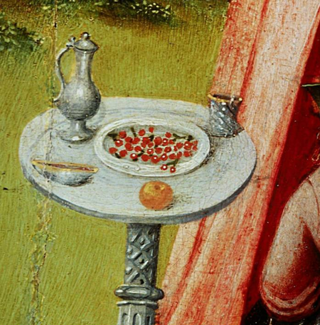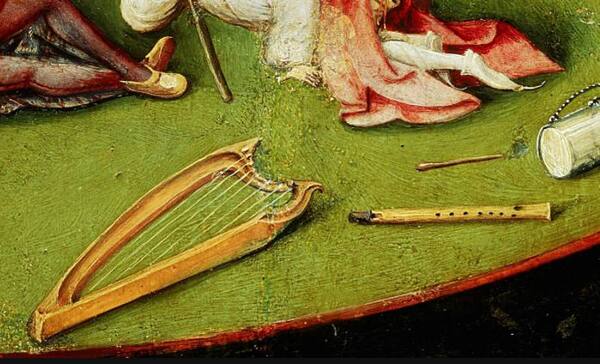 Разбросанные музыкальные инструменты, которые ассоциируются с соблазном. У босха, музыка часто является символом мирского удовольствия, слабости. Красные ягоды — символ похоти.