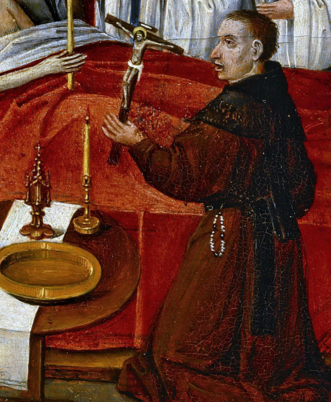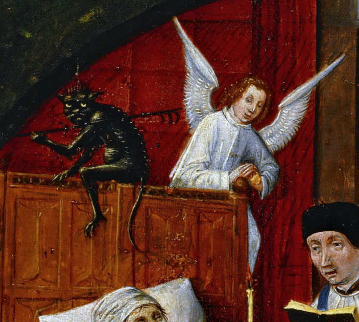 Образы ангела и демона, которые борются за душу умирающего. Священник с распятием в руке, как символ того, что каждый может искупить свои грехи перед смертью Скелет, притаившийся за кроватью, напоминает о бренности человеческого тела.