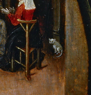 Обилие предметов роскоши, таких ремень в шкатулке, хрустальные и золотые сосуды на шкафу символизируют гордыню и жадность. Четки, использующиеся для чтения молитв, лежат без дела, усиливая бездуховность сюжета. (Семь смертных грехов и четыре последние вещи / Иероним Босх / ок. 1500)