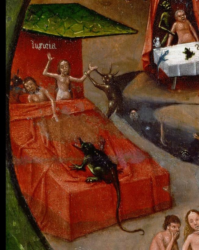 Изощренные пытки в аду соответствуют грехам, которые определяли этих людей при жизни: похотливая пара находится в красной постели в окружении демонов, жадные варятся в котле, а слуга дьявола подкидывает им монеты.