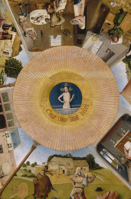 Центральная композиция картины изображена в виде глаза, всевидящего Ока. Радужка — семь смертных грехов, зрачок — Воскресший Христос. Надпись внизу гласит: «Внимание, внимание, видит Бог». Картина является аллегорией на потусторонний мир, где каждый будет судим справедливым и ведающим все Богом. Жившие по законам добра отправятся в рай, грешники — в ад. (Семь смертных грехов и четыре последние вещи / Иероним Босх / ок. 1500)