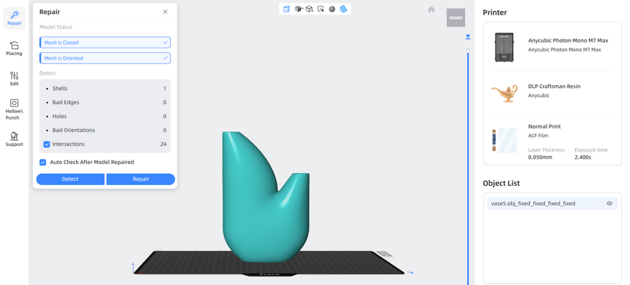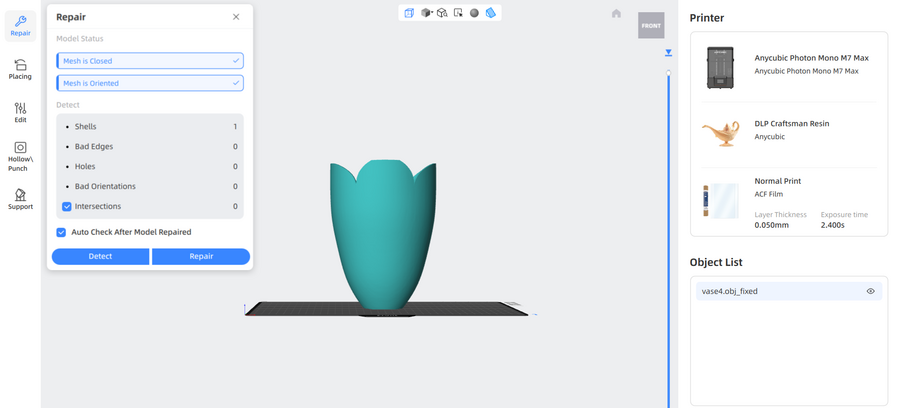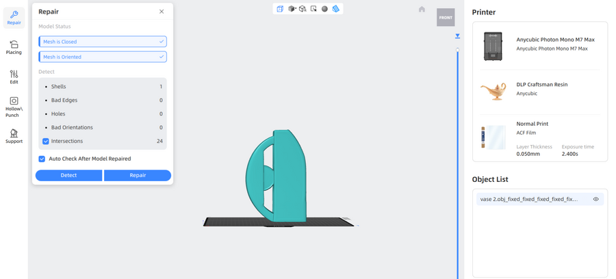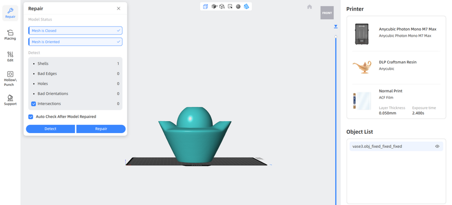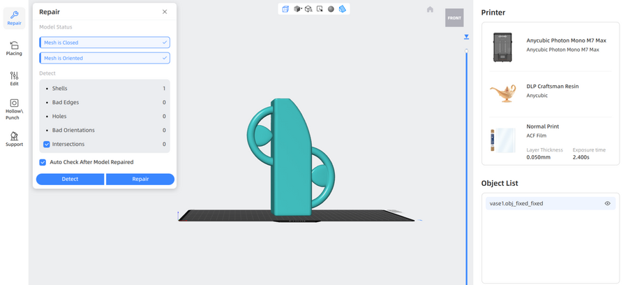 После небольшой ручной доработки моделей (уточнение пропорций и отверстий) проверка моделей на пригодность для печати была произведена в AnycubicPhotonWorkshop.