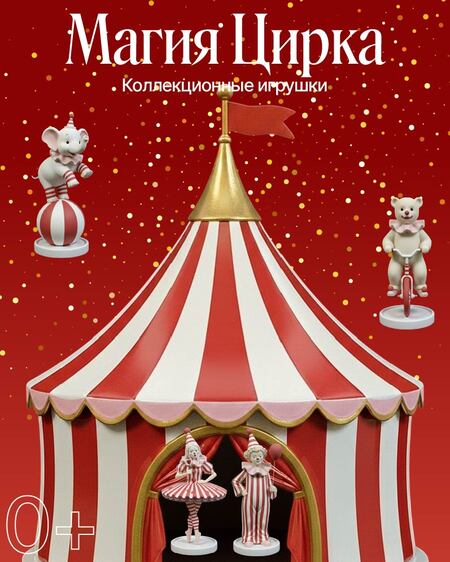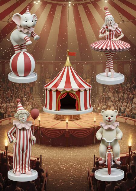 Коллекция декоративных игрушек, вдохновлённая атмосферой классического цирка и сказок из детства. В серию входят цирковые персонажи и элементы сцены: слонёнок-акробат, балерина, медвежонок на велосипеде, клоун и цирковой шатёр. Каждая фигурка установлена на аккуратной подставке, что делает её устойчивой и удобной для размещения в интерьере или коллекции.