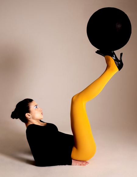В этой съемке я решила поэкспериментировать с геометрией и материалами, исследуя, как тело взаимодействует с цветом. Главным акцентом я сделала ноги — они выстраиваются в четкие, почти графичные фигуры.