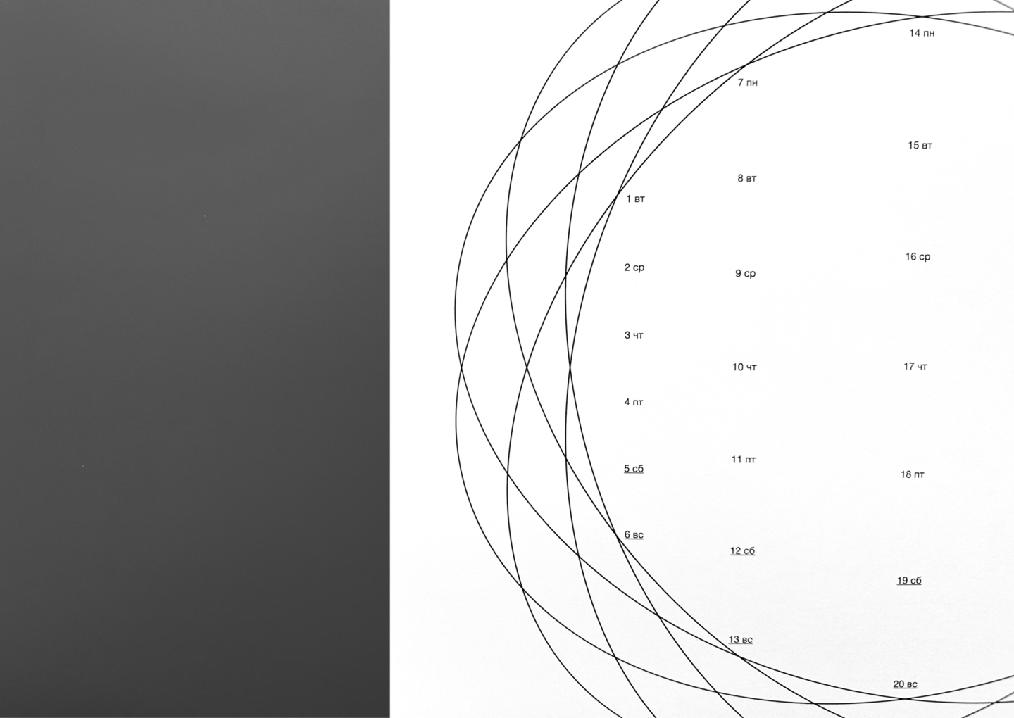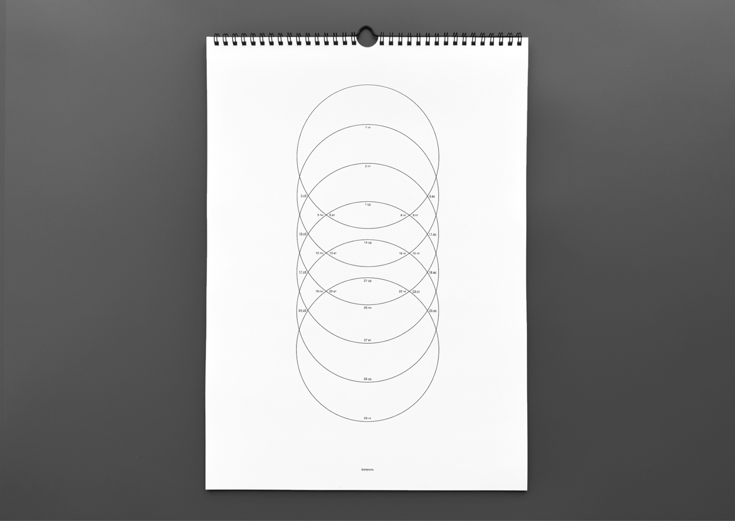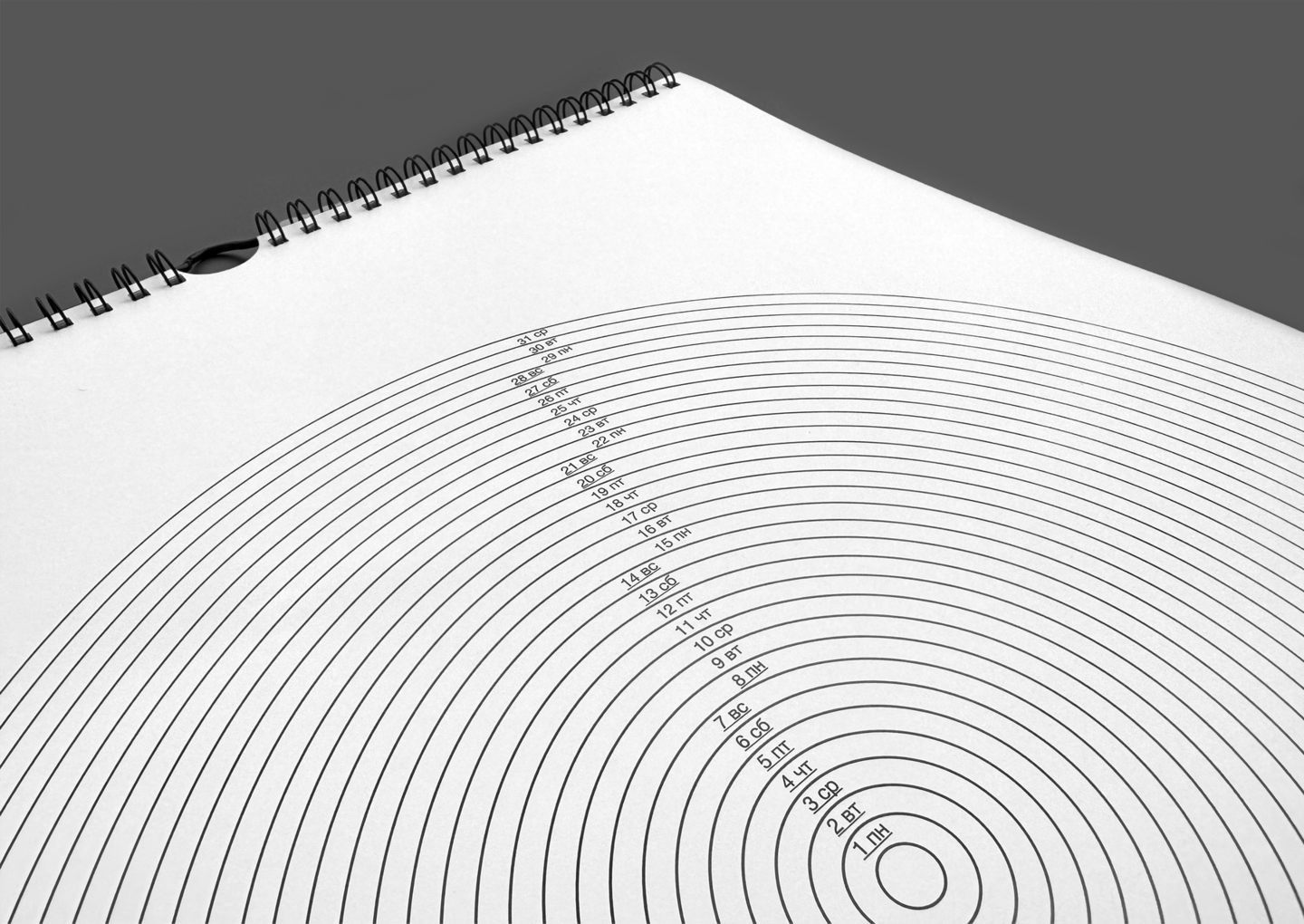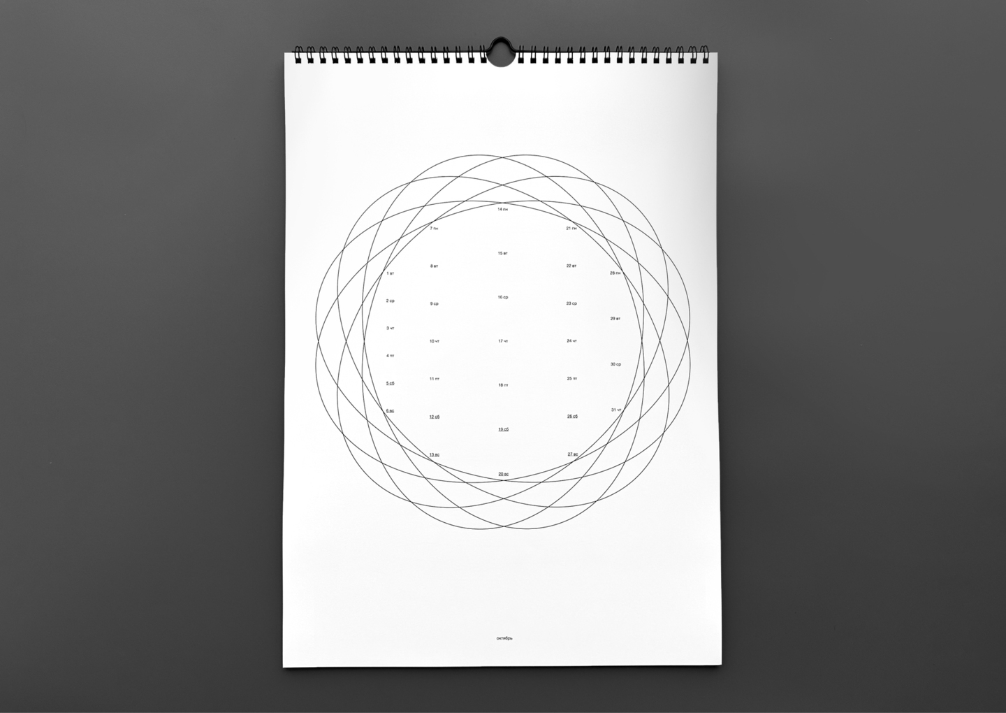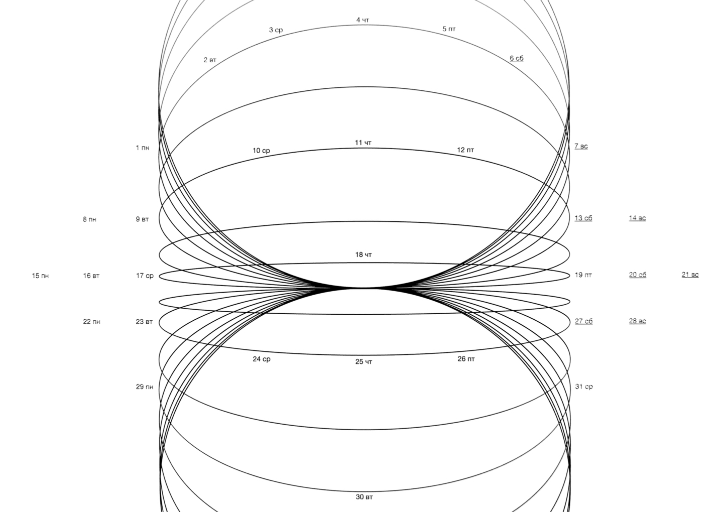 Здесь сетка используется свободно: месяцы заходят друг в друга и свободно пересекаются, тем самым показывая что время и его периодизация — условны, между сущностями времени, будь это день или месяц, нет чётких границ