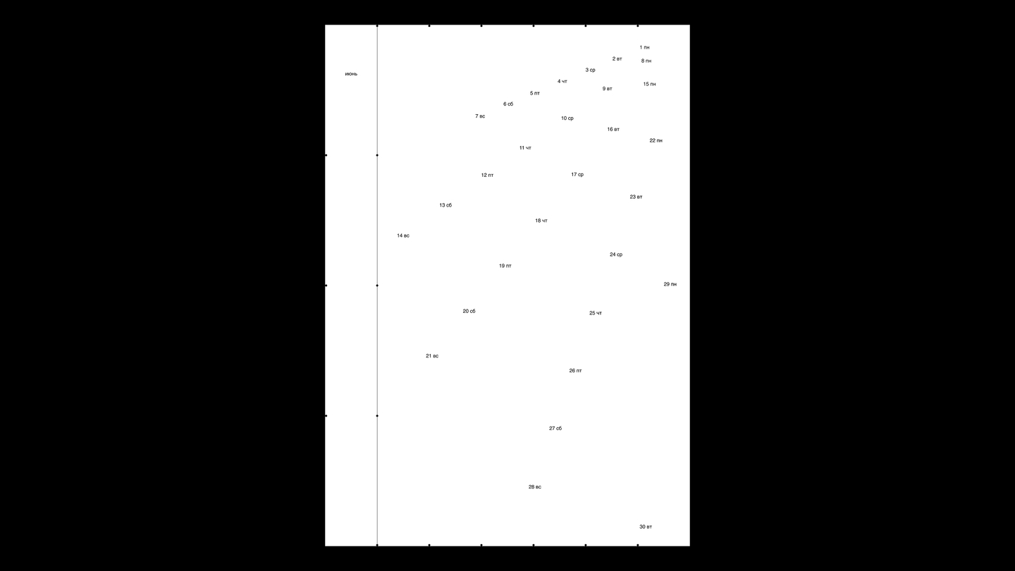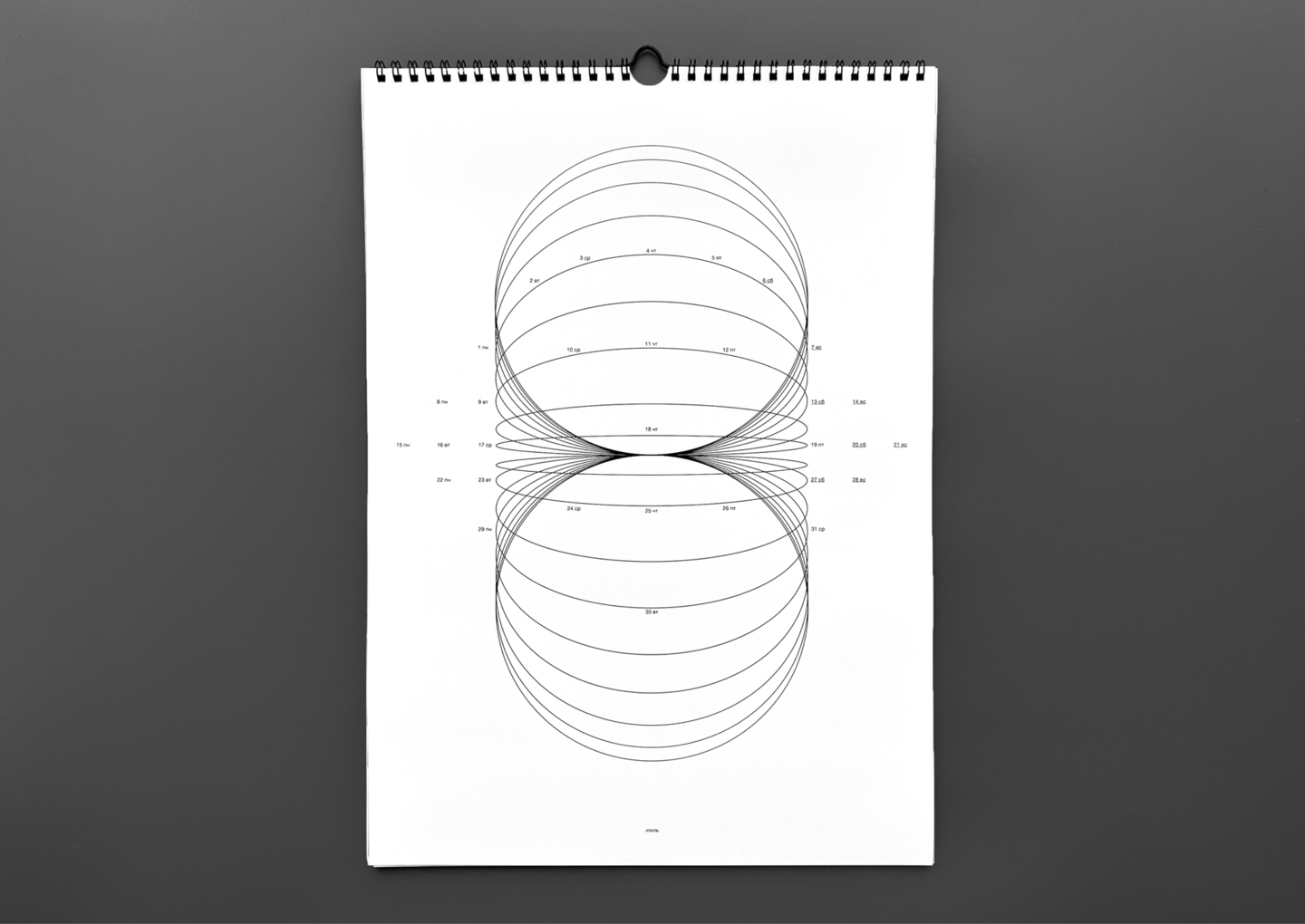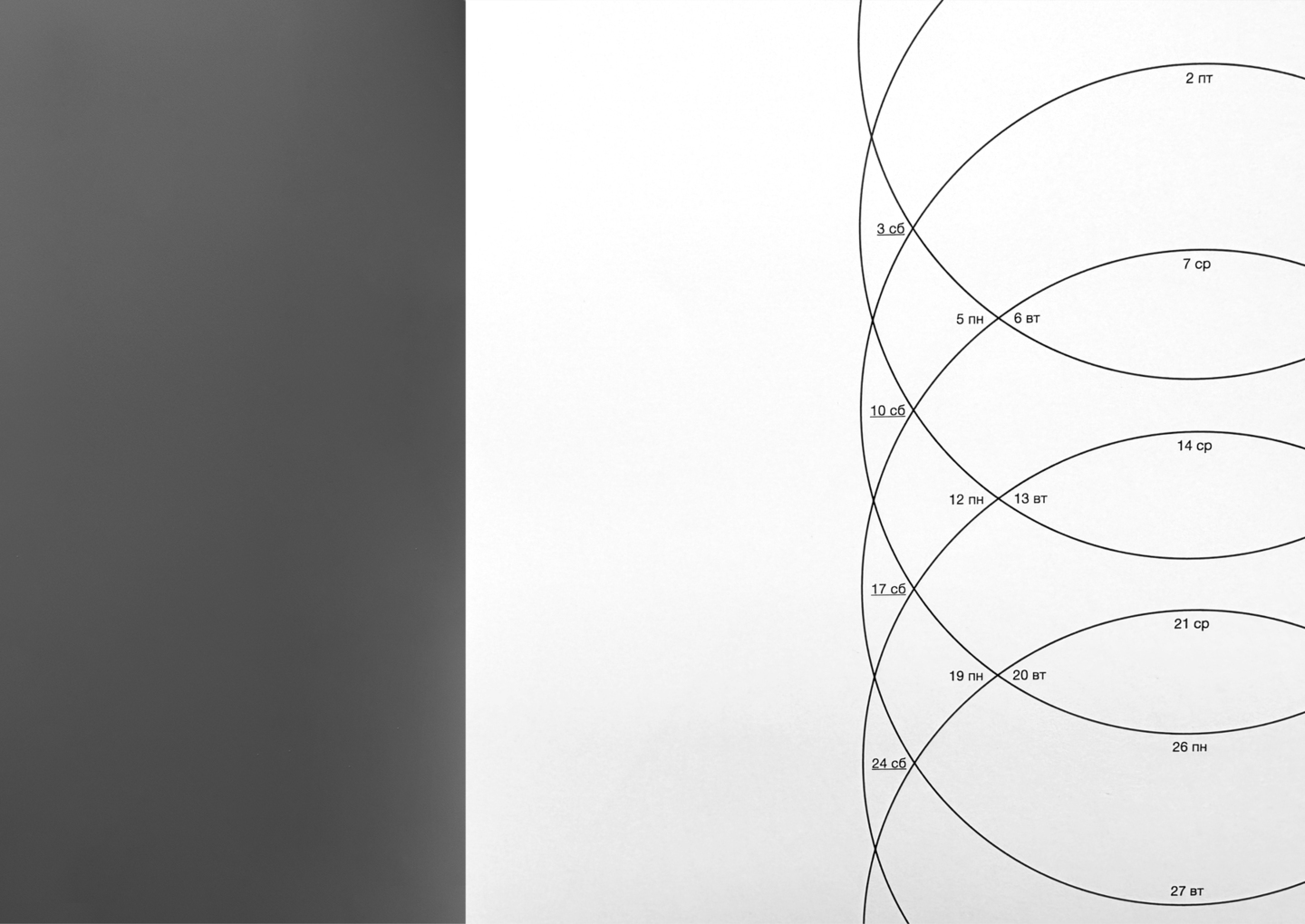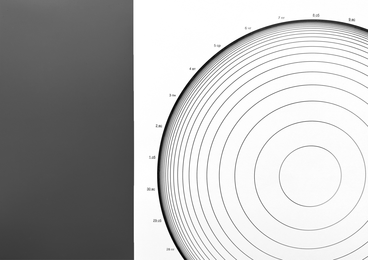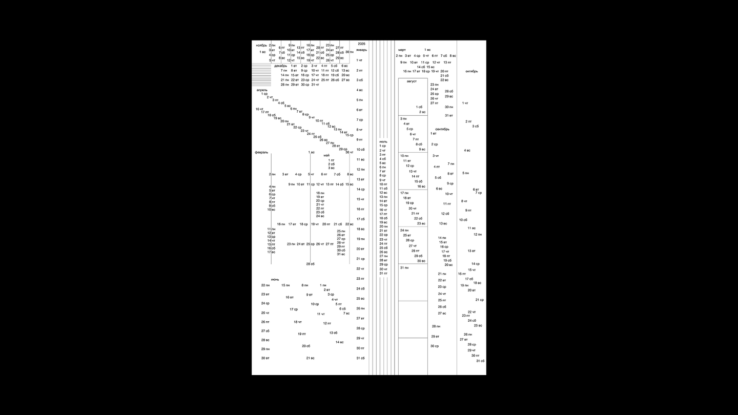 Здесь сетка используется свободно: месяцы заходят друг в друга и свободно пересекаются, тем самым показывая что время и его периодизация — условны, между сущностями времени, будь это день или месяц, нет чётких границ