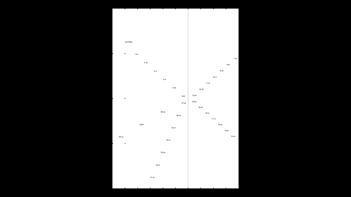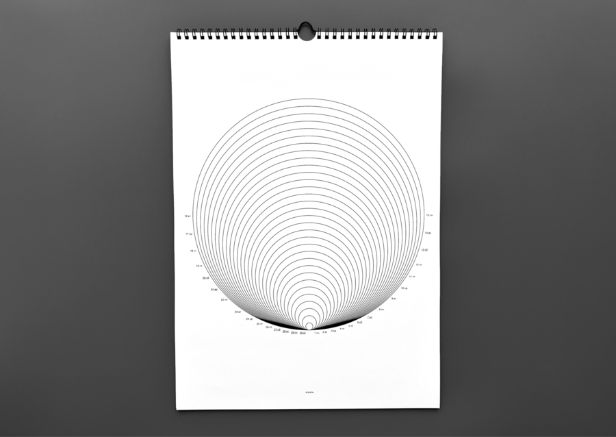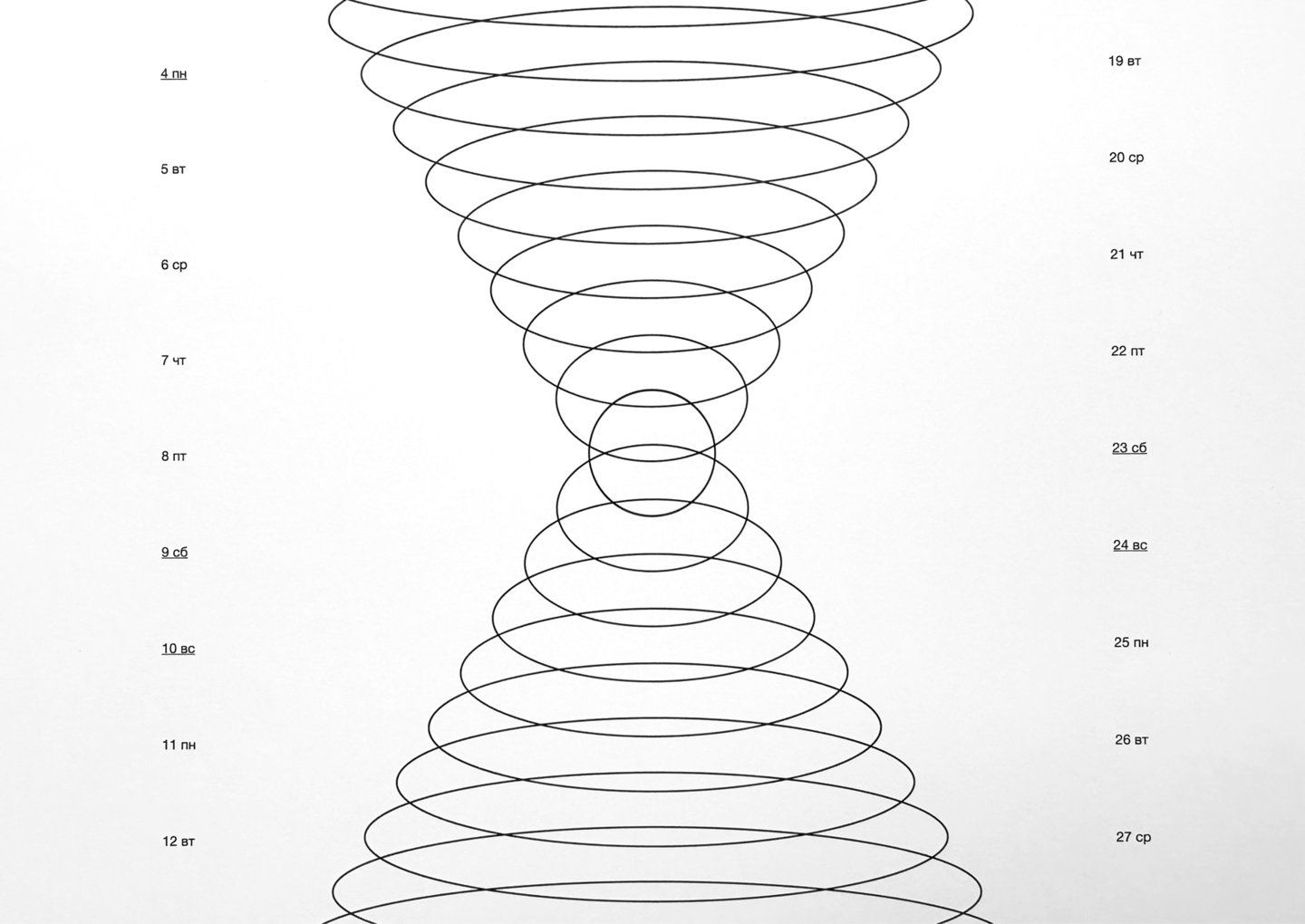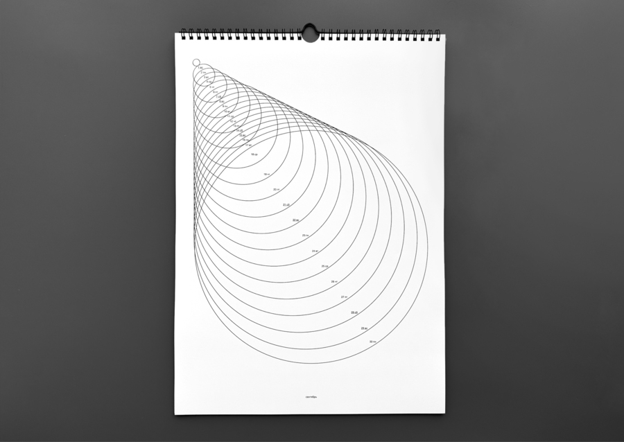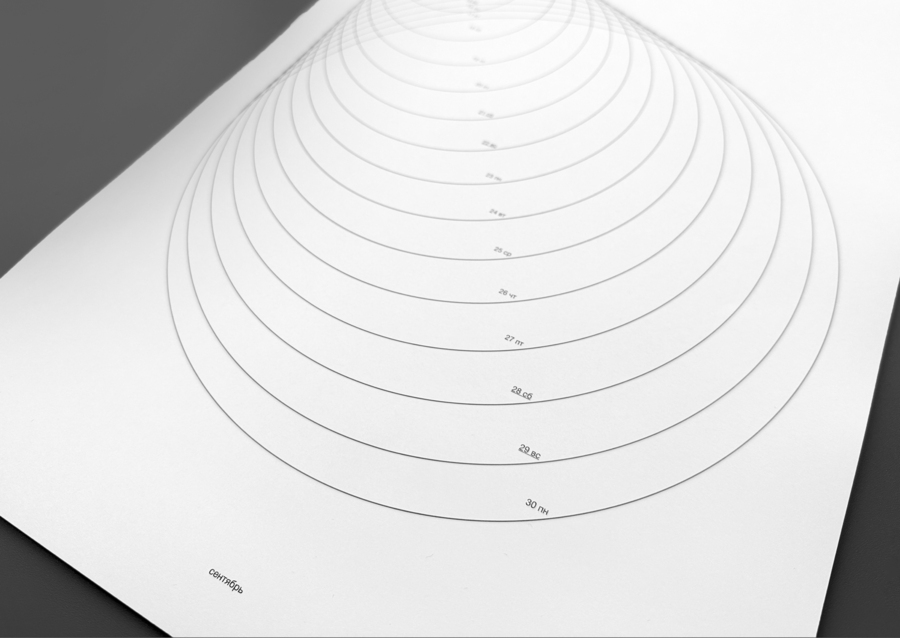 Работа становится исследованием точки и её возможностей в контексте каждого месяца и его характерных особенностей (погоды, природных явлений). Задача — найти в точке и с её помощью систему для календарной сетки. Абстрактные композиции создают у каждого зрителя уникальные ощущения от сезона и месяца, предлагая погрузиться в собственные восприятия и задуматься о глубине понятия такой простой фигуры, как точка