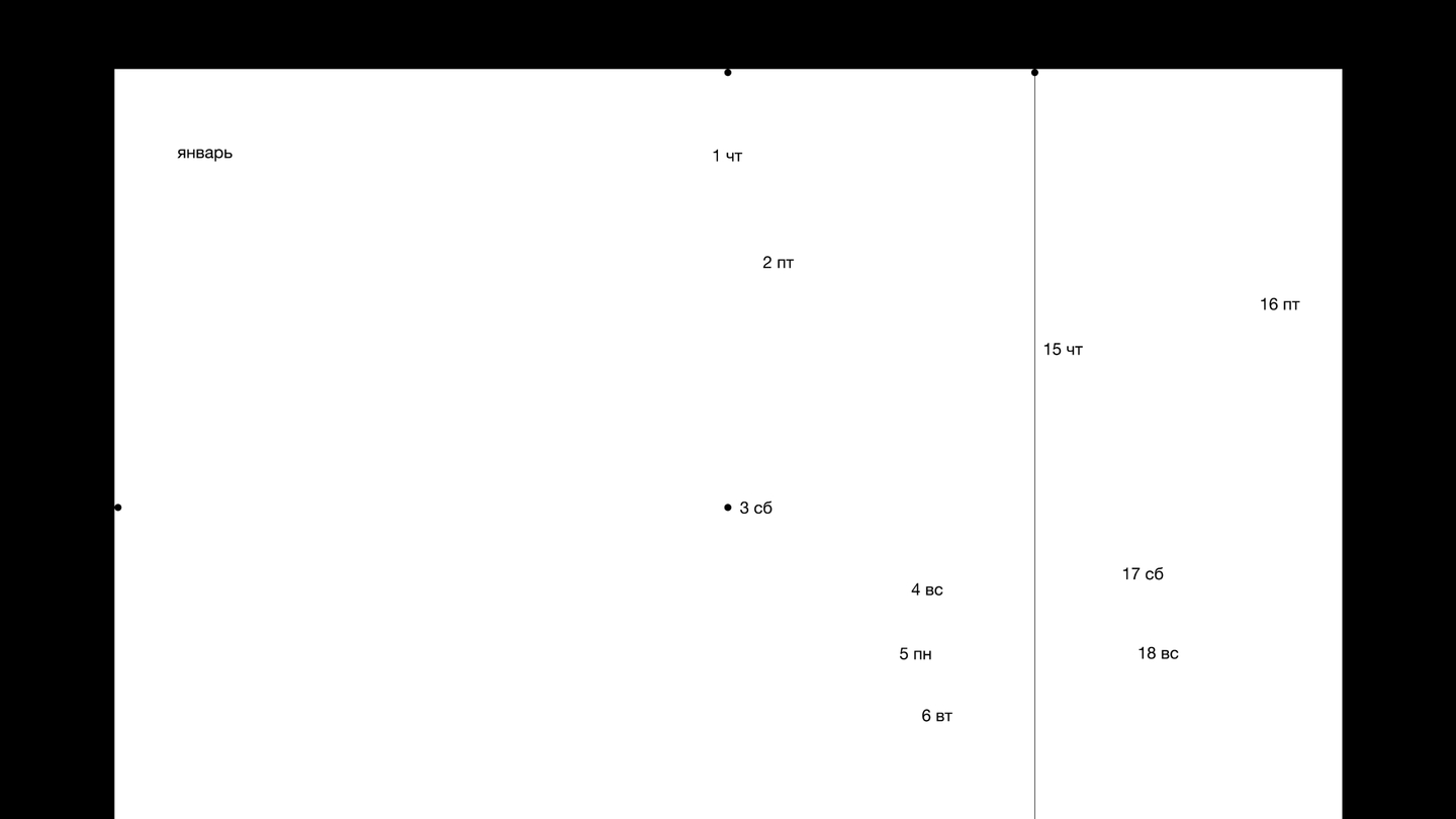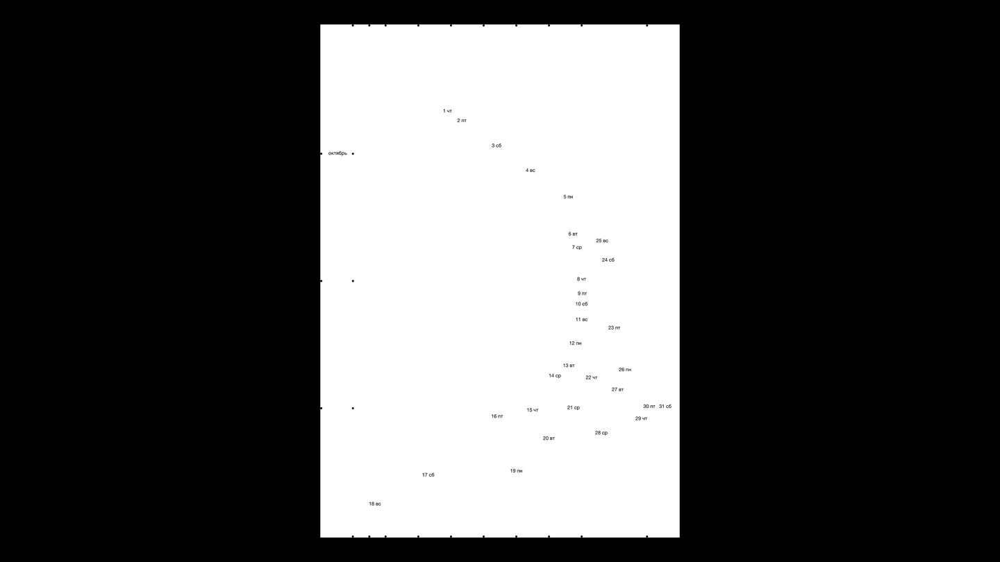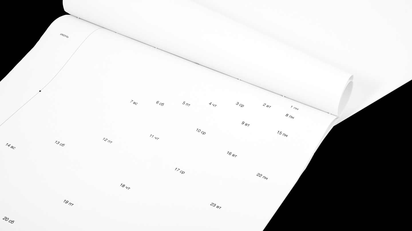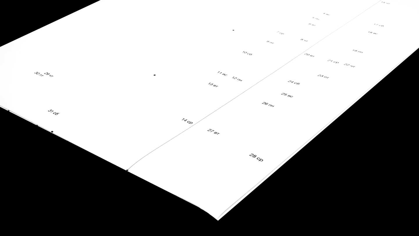 Работа становится исследованием точки и её возможностей в контексте каждого месяца и его характерных особенностей (погоды, природных явлений). Задача — найти в точке и с её помощью систему для календарной сетки. Абстрактные композиции создают у каждого зрителя уникальные ощущения от сезона и месяца, предлагая погрузиться в собственные восприятия и задуматься о глубине понятия такой простой фигуры, как точка