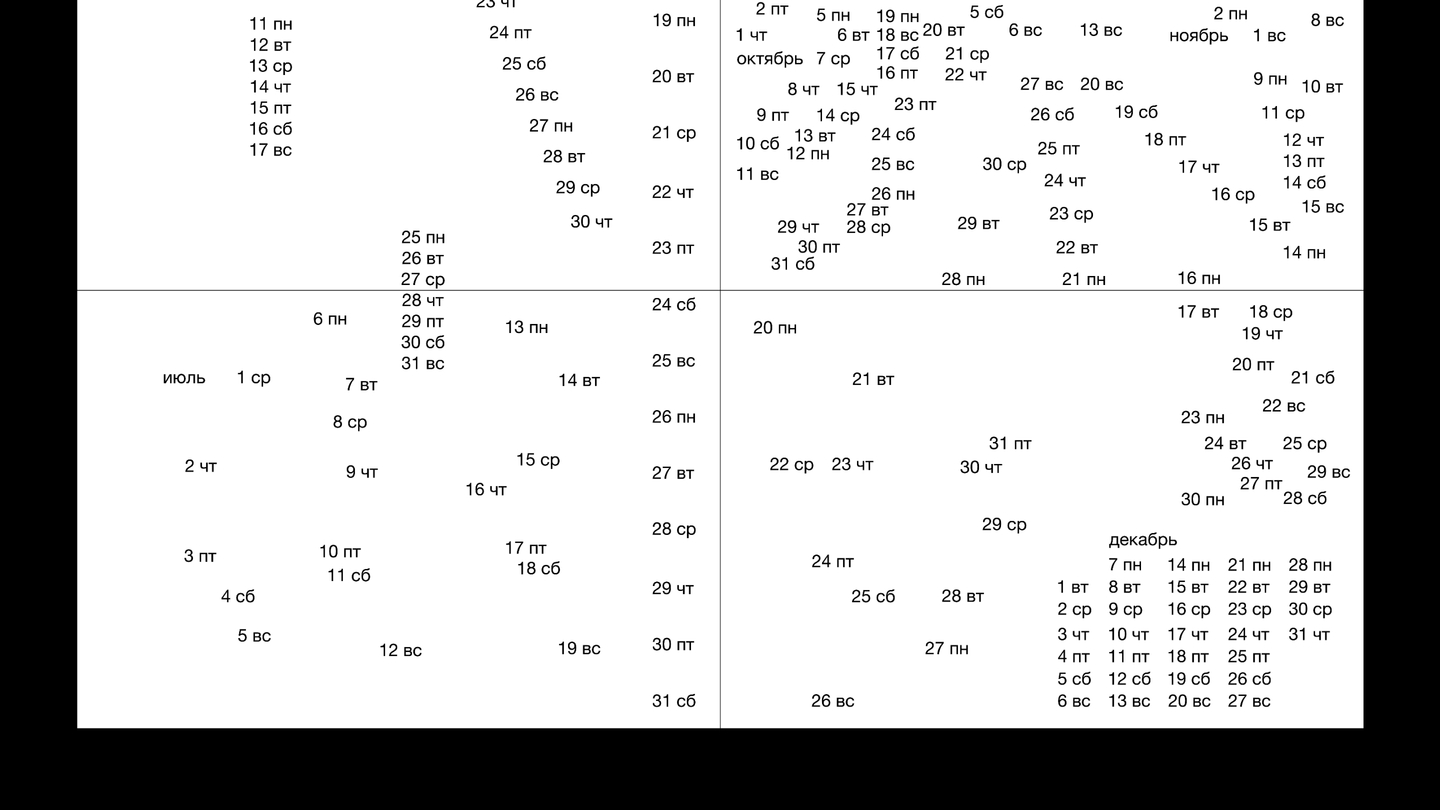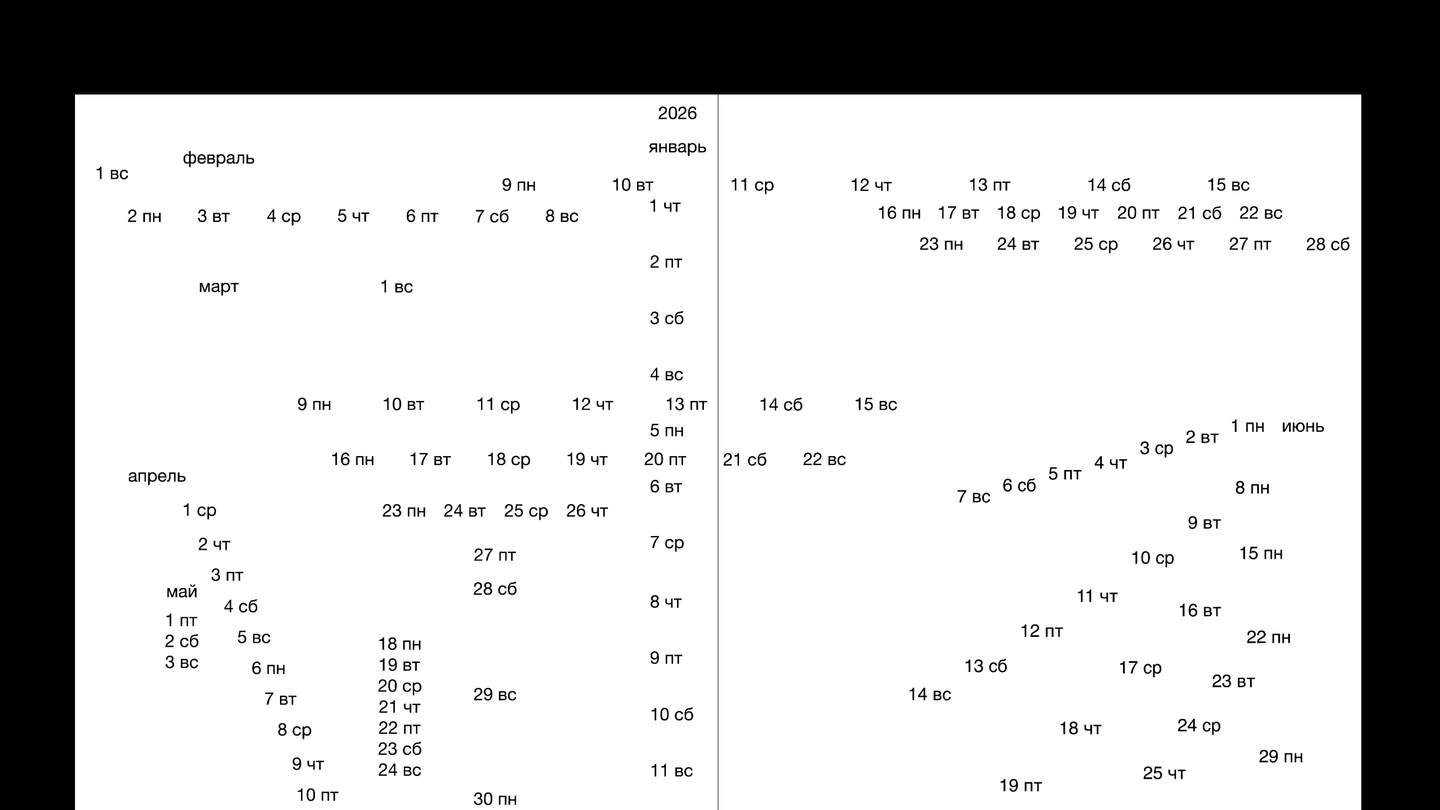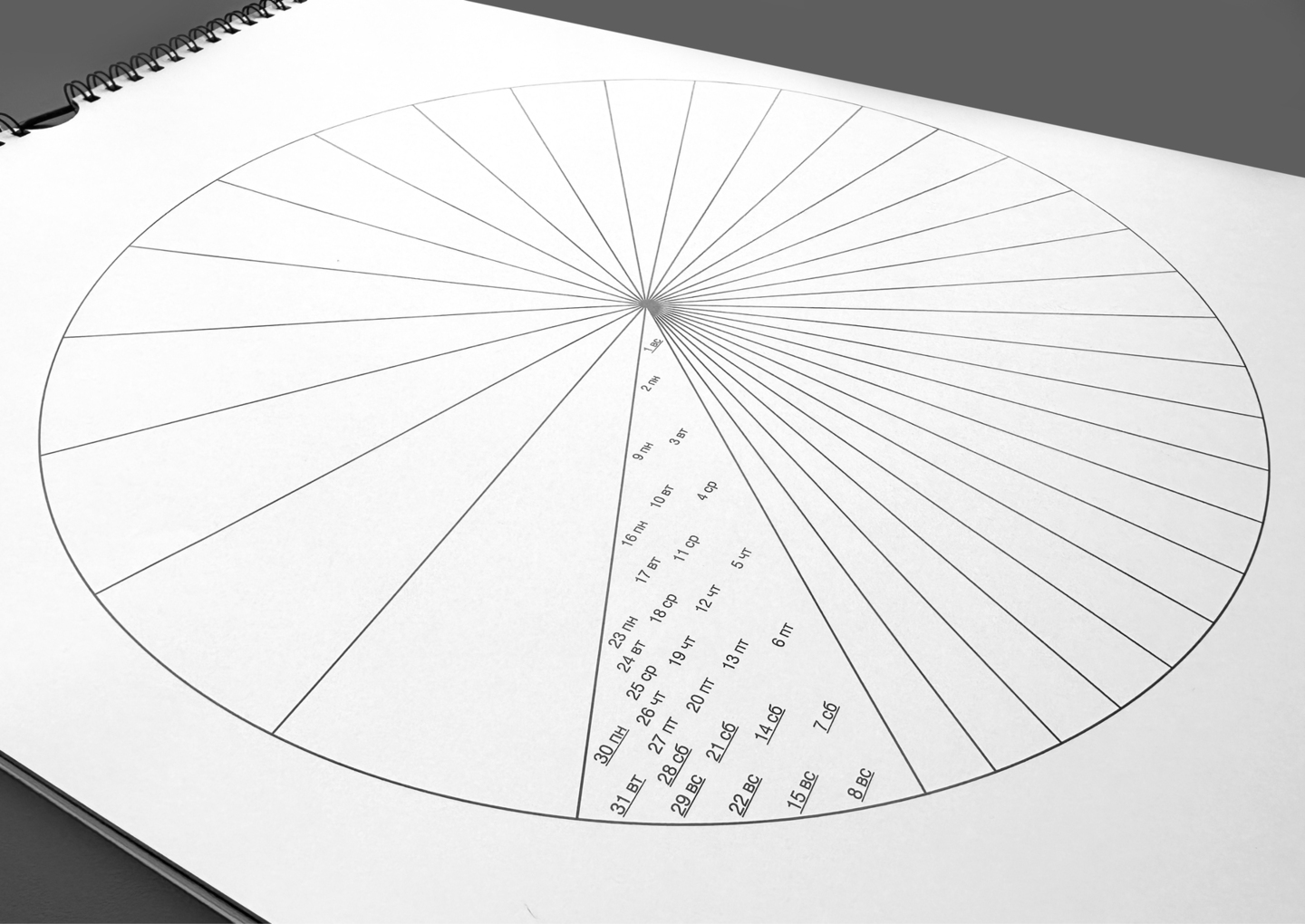 В этом календаре сетка поделена на 4 сегмента — 4 сезона года, и месяцы перетекают друг в друга: где заканчивает один, плавно начинается следующий
