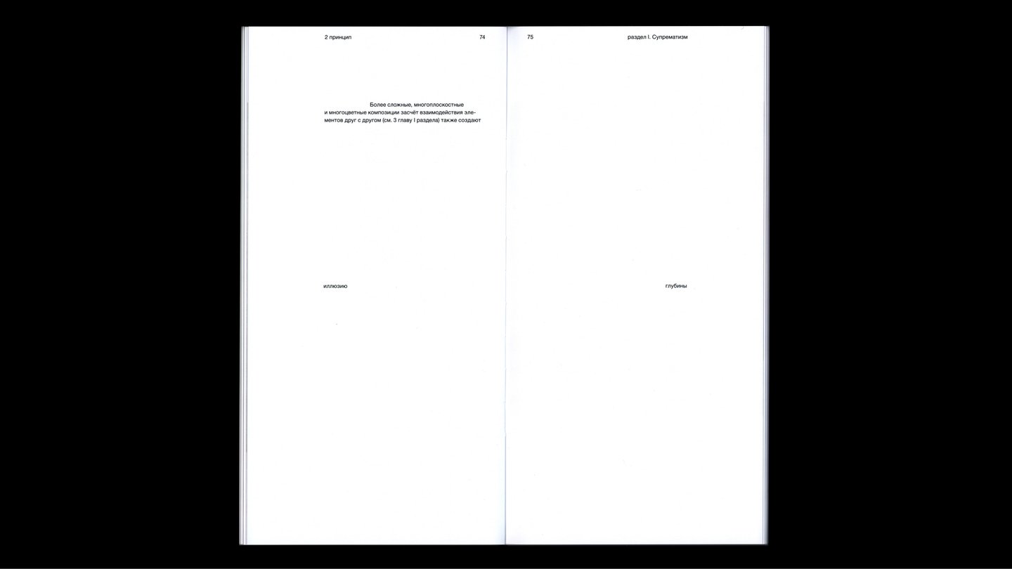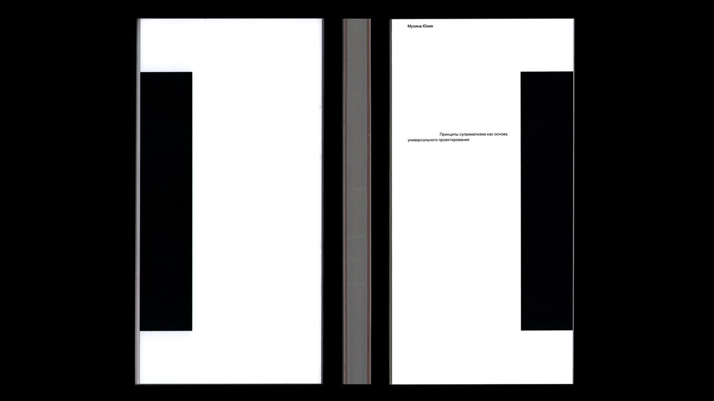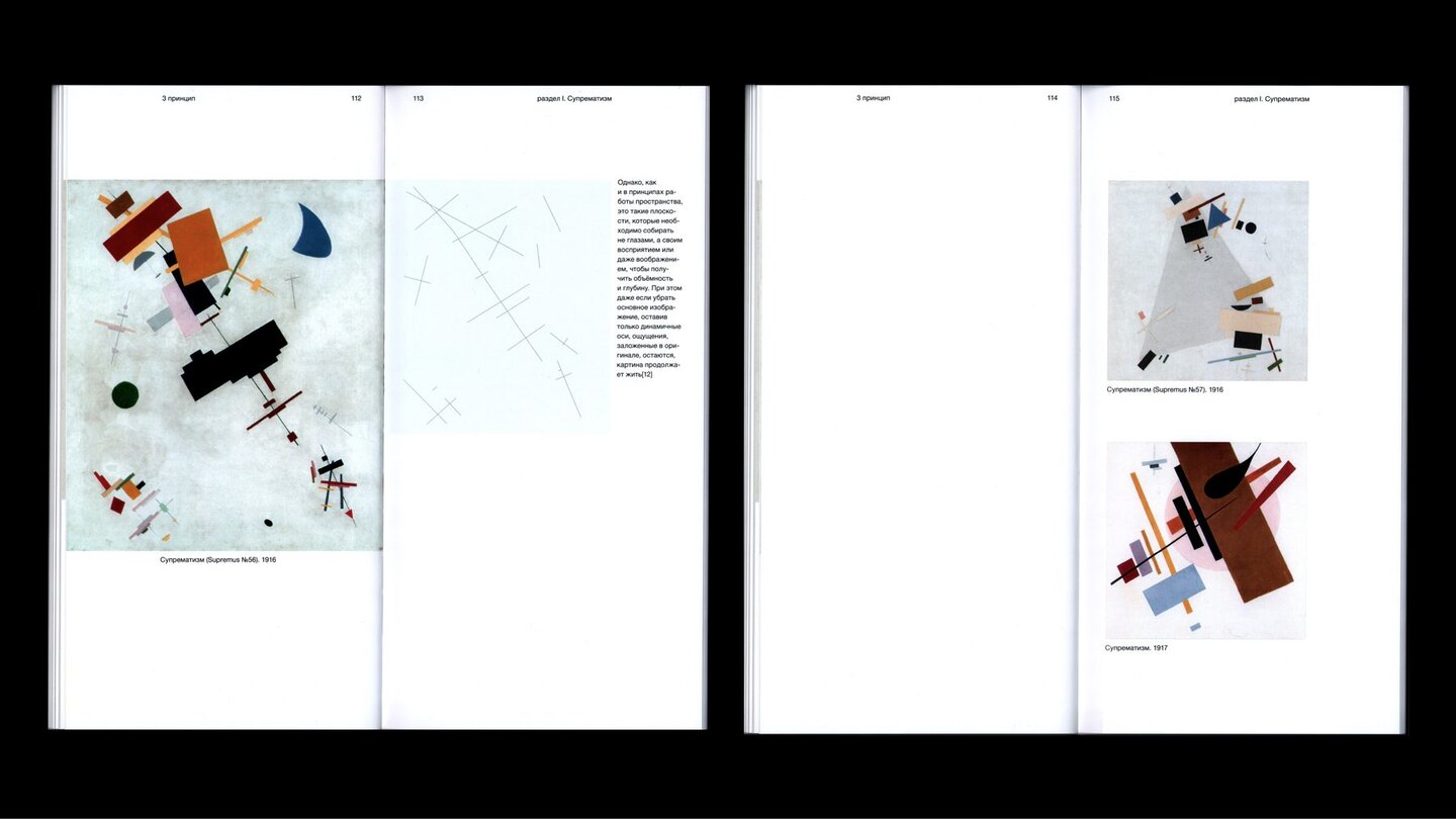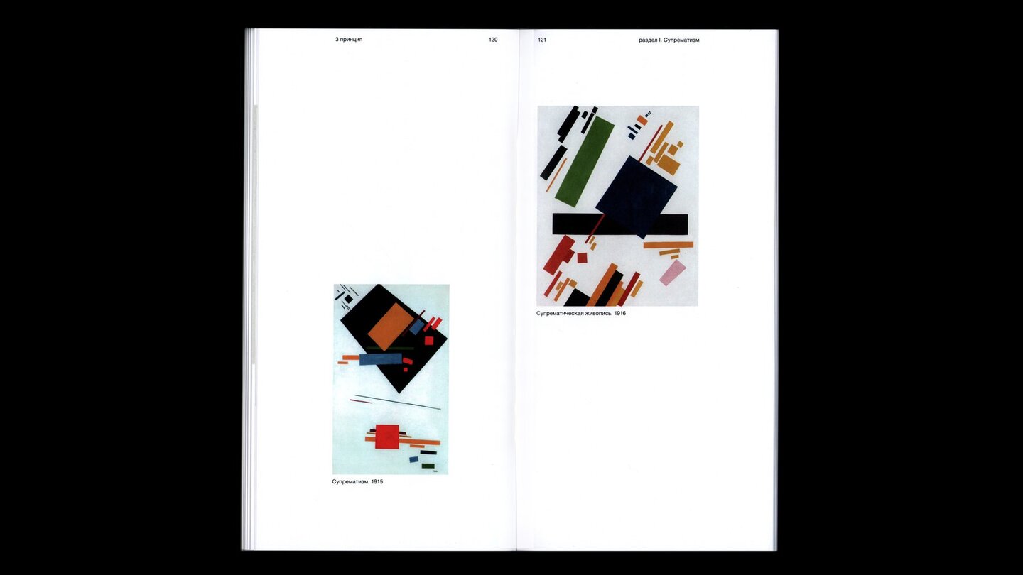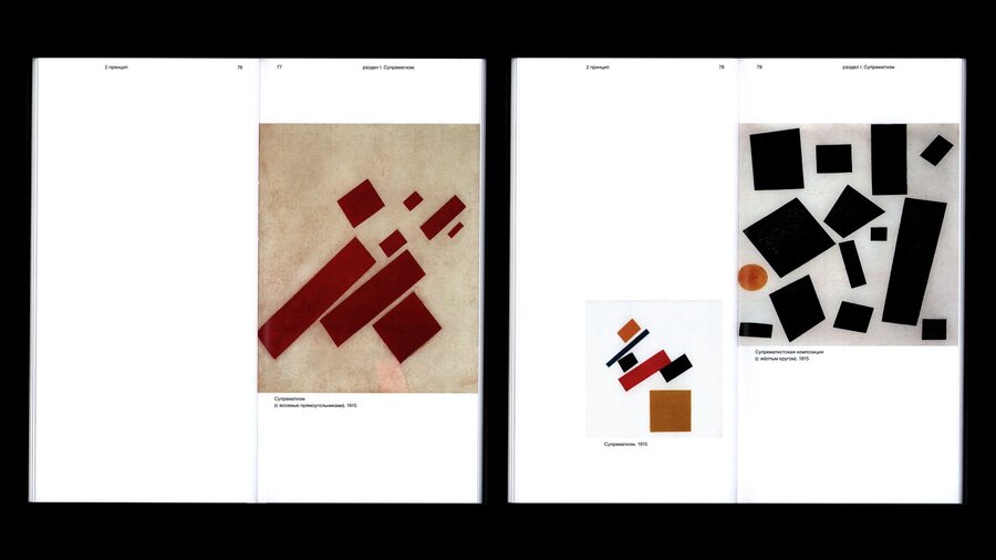 В основу макета положен «нуль форм» — Чёрный квадрат. Внутри него и текст, и изображения могут передвигаться свободно, даже выходить за его границы, подчёркивая бесконечность супрематического пространства, но основная задача их местоположения — «проявить» квадрат, тем самым доказывая универсальность этой формы