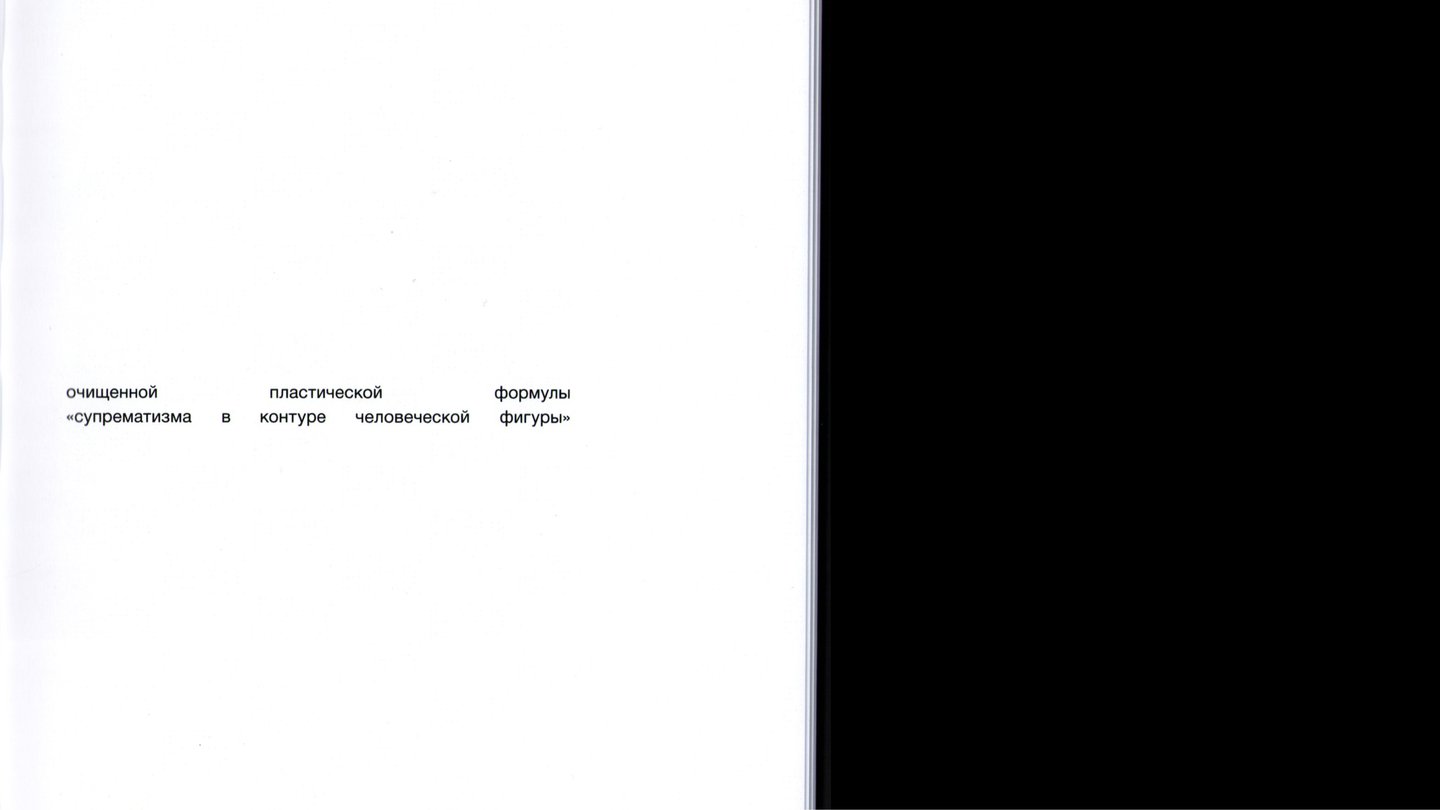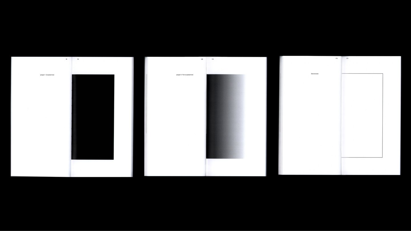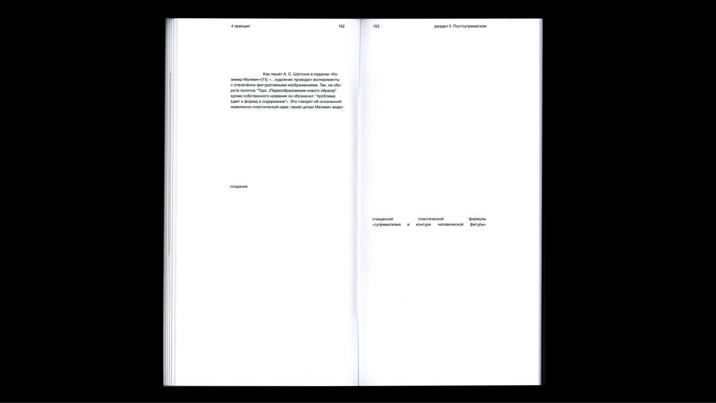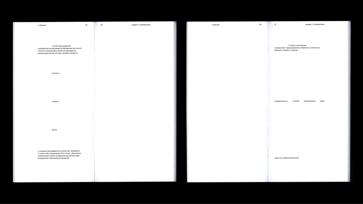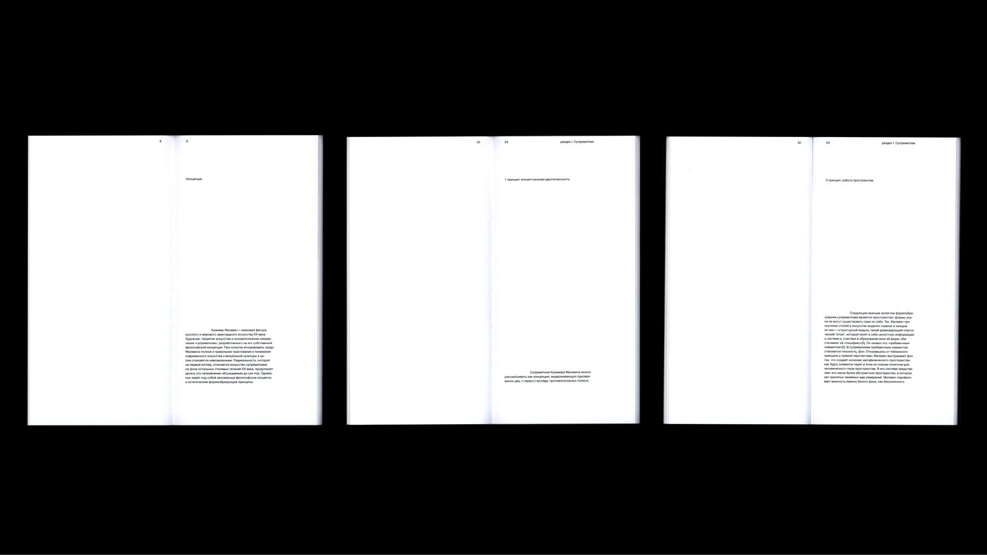 В основу макета положен «нуль форм» — Чёрный квадрат. Внутри него и текст, и изображения могут передвигаться свободно, даже выходить за его границы, подчёркивая бесконечность супрематического пространства, но основная задача их местоположения — «проявить» квадрат, тем самым доказывая универсальность этой формы