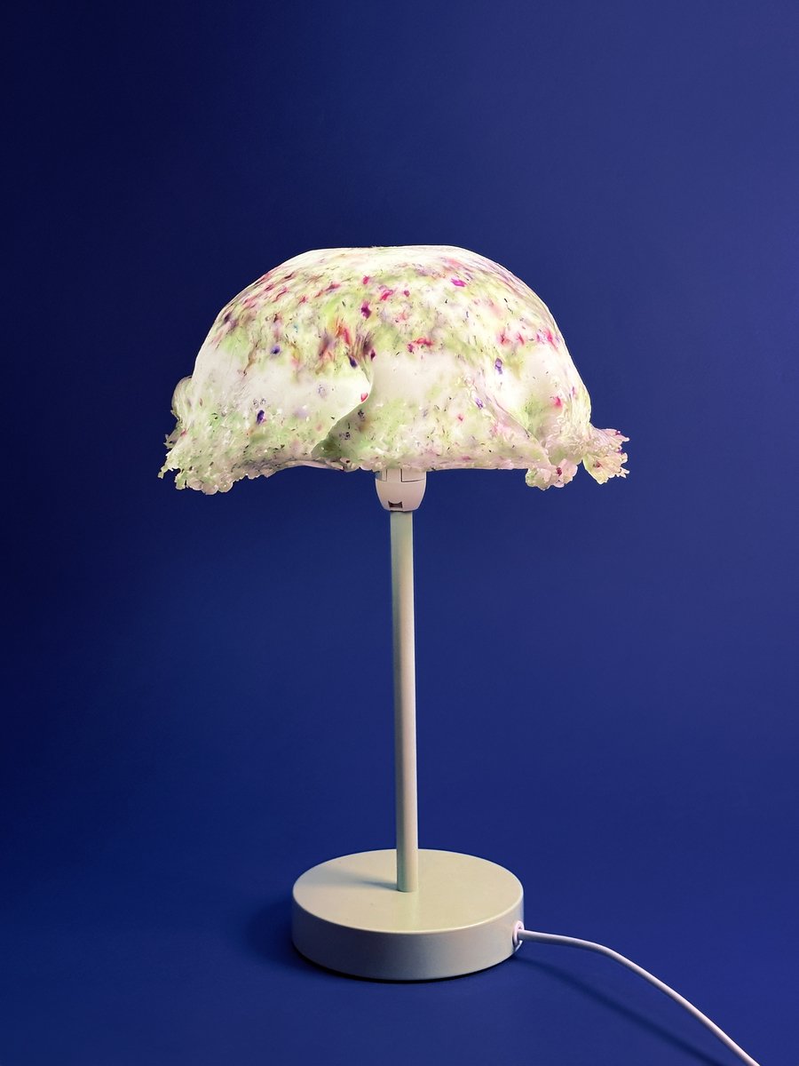 Materiality functions as a key narrative element. The re • jelly • f lamp is produced from recycled thermoplastic (HDPE or PET) using a heat-forming technique that creates non-repetitive, organic textures. These surfaces softly diffuse light, evoking underwater bioluminescence and reinforcing the association between plastic, water, and living organisms. Each object is intentionally unique, emphasizing biological diversity over industrial uniformity.