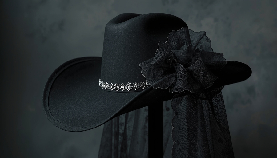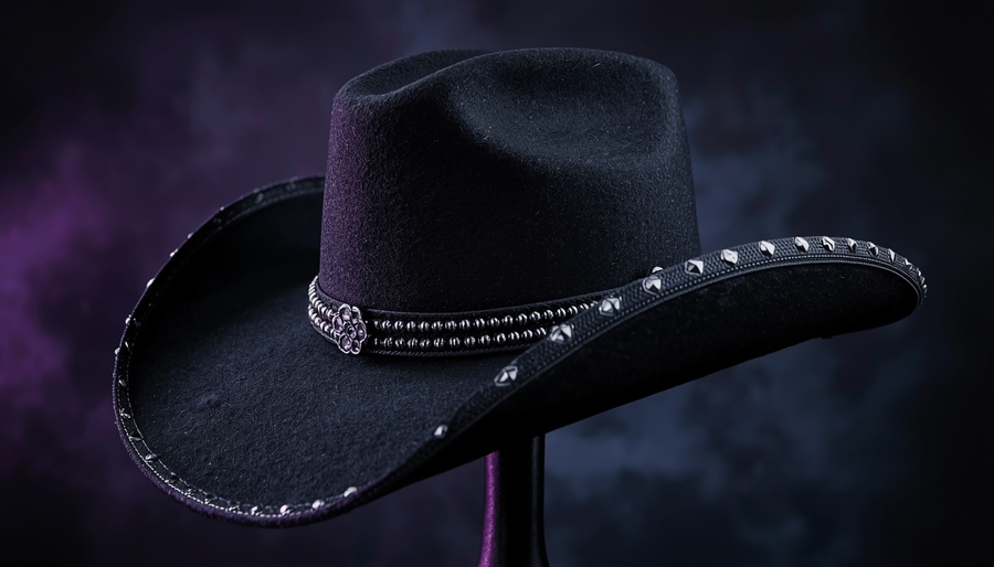 · Symbolism and Form: The classic shape of a cowboy hat is recognizable, but we infuse it with new meaning. Sharper silhouettes, asymmetry, details reminiscent of gothic architecture or Victorian chic — this is how the unique style of MIDNIGHT RODEO is born. · Color and Material: Deep black, the color of a starry sky, dull silver, or matte iron instead of shiny gold — color and texture immediately convey the «midnight» mystery. Natural leather, wear and tear (a distress effect) speak of «cowboy» authenticity, a history lived under the open sky. · Visual Style: Photography in the lookbook, social media, or packaging design will be consistent with the MIDNIGHT RODEO aesthetic — desolate landscapes under moonlight, play with sharp shadows from a campfire, dramatic silhouettes against a sunset. This creates not just a product image, but the necessary mood and brand atmosphere.