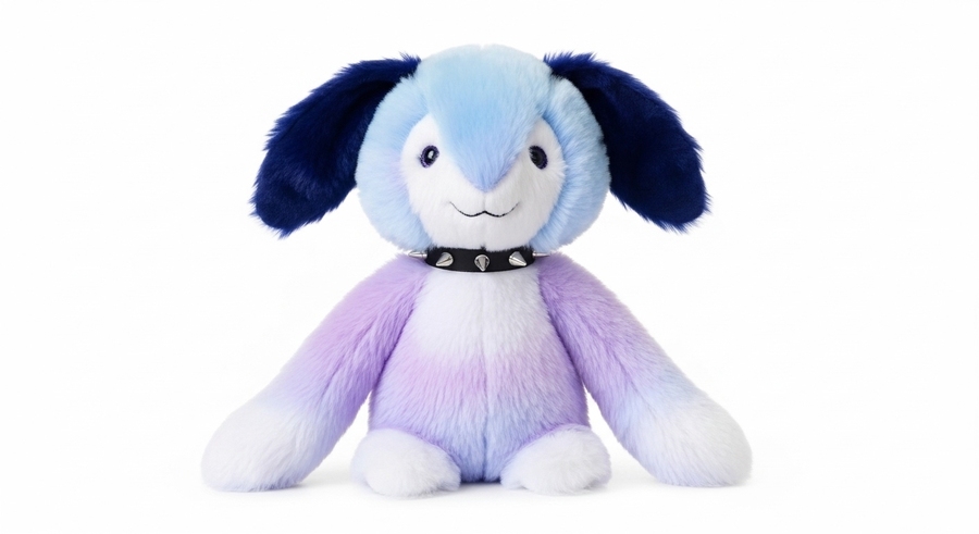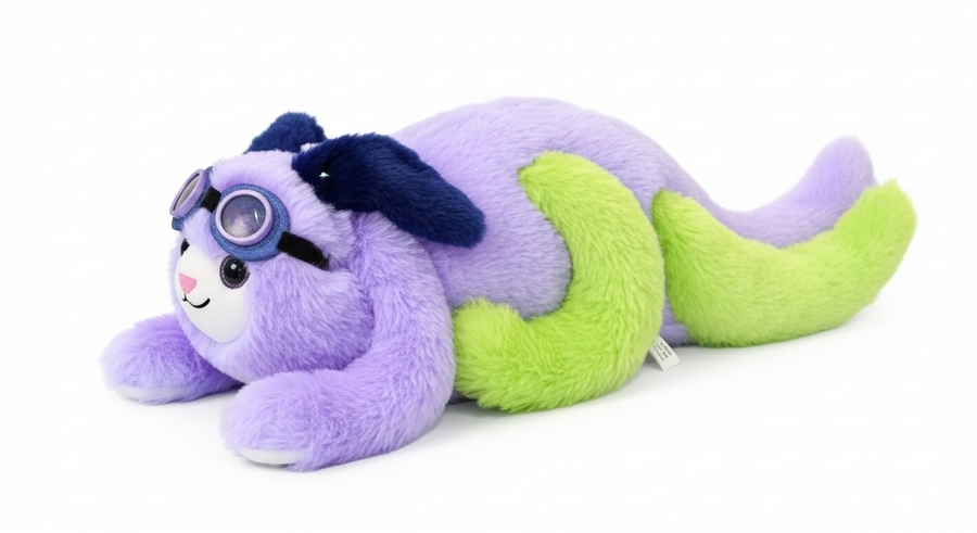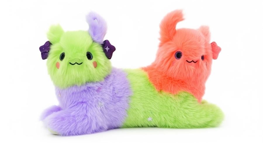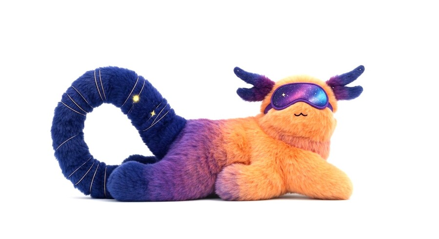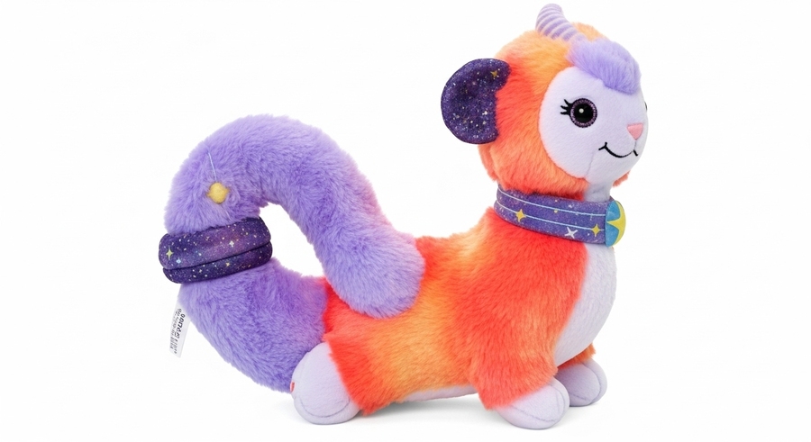 A cute and unusual plush toy, inspired by animals but transformed into imaginative, colorful characters. Soft, fluffy fur like real plush. Colors include deep midnight blue, bright lavender, lime green, warm orange, and vivid coral. The toy has playful, flowing shapes, a joyful personality, and cosmic accessories. Photorealistic studio product photo on a clean white background, full body, highly detailed, cozy and whimsical.