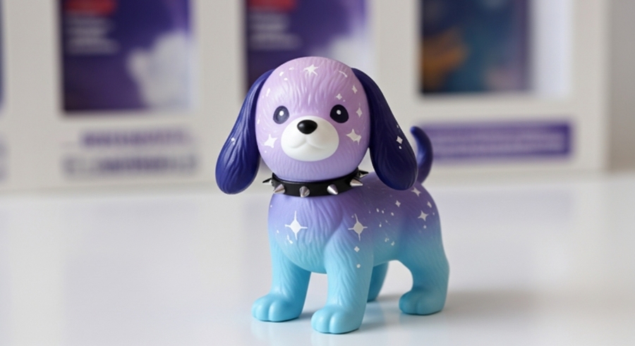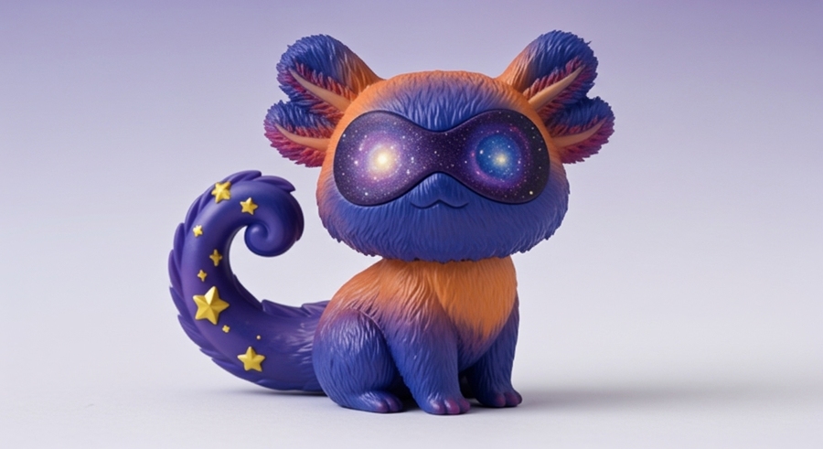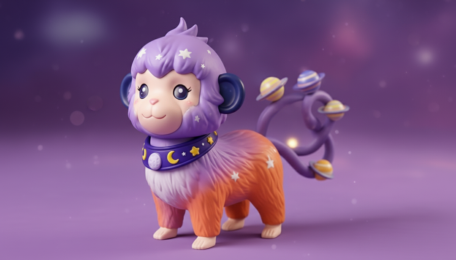 1. A miniature collectible plasic figure inspired by a cheerful cosmic monkey mixed with llama with soft purple and bright orange fur with white details. Around its tail are tiny ring-shaped accessories resembling planets, glowing with starlight. The toy wears a cosmic collar with moon and star motifs. Cute, detailed, and full of personality. Photorealistic studio lighting, detailed texture, capsule toy style for collectors and dreamers. 2. A tiny collectible figure inspired by a cosmic creature with a curled tail and a galaxy-patterned eye mask. Its fur is soft and fluffy, blending shades of deep blue, violet, and orange. its ears are divided in two, like the axolotl ears. Small golden star details shimmer on its tail, adding a magical cosmic touch. Designed as a capsule toy, photorealistic studio shot, highly detailed texture, cute proportions, joyful and imaginative aesthetic. 3. A small collectible figure of a cosmic puppy with long ears and a soft gradient fur from pale lilac to sky blue with white cosmic details. Its ears are dark indigo. The nose is white. It wears a tiny black collar with metallic spikes, adding a playful contrast to its dreamy colors. The texture with details and volume. Photorealistic studio product photo, miniature scale, clean and modern look.