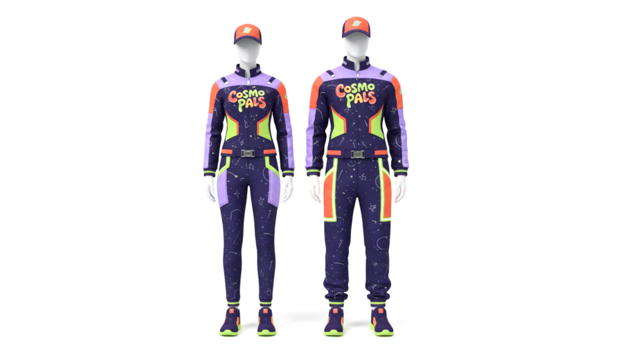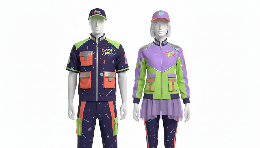 A high-quality hyper-realistic studio render of two mannequins — one male and one female — standing side by side on a white background, wearing the official CosmoPals pop-up store uniforms. The design is futuristic, colorful, and creative, combining the spirit of space adventure and playful energy.