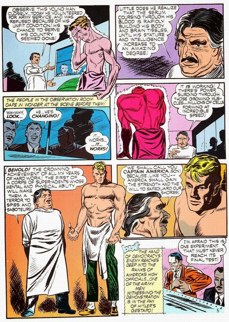 Герой был создан упомянутым ранее Джеком Кирби и Джо Саймоном. Как и в дизайне Супермена, у Капитана Америки в костюме использованы яркие открытые цвета, в сочетании со звездами и полосами, определенно отсылающими нас к американскому флагу. Это национальный воин, образец для подражания, глядя на него у читателя сразу мог подняться патриотический дух. Хоть некоторые визуальные решения и схожи с Суперменом, Капитана Америку отличает более серьезный вид, маска, отсутствия плаща, выразительный щит, подчеркивающий готовность героя защищать народ.