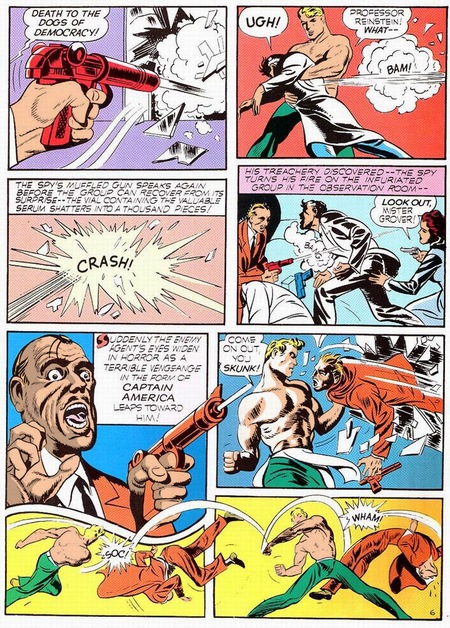 Например это заметно на страницах Капитана Америки. Яркие цветные фоны, выразительно разделяющие сцены в разных фреймах, силуэт героя, выделяемый одним акцентным оттенком, разноцветные пистолеты.
