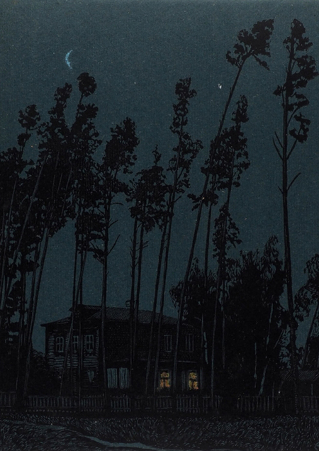«Ночной пейзаж». 1940-е. Бумага, цветная линогравюра. 28,8×34 см.