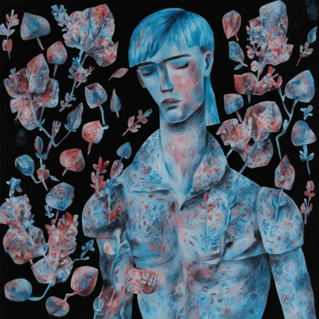 Промпты: 1. «surreal portrait of a man» 2. «The portrait of a young man is surreal with blue hair, he is located on a black background with flowers»