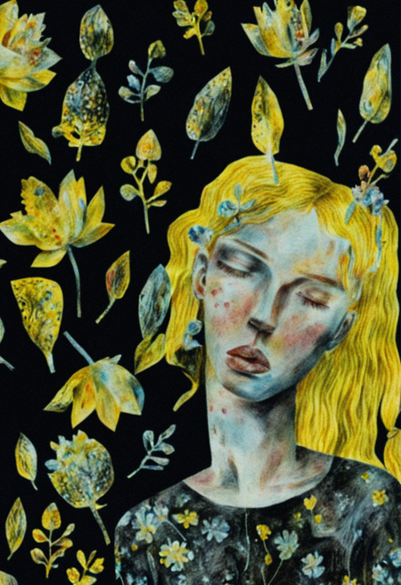 Промпт: «Surreal portrait of a young girl with yellow hair, flowers in her hair and she is positioned on a black background»