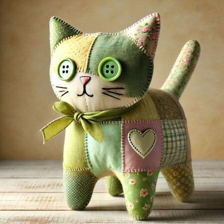 2 — according to the 3D model I attached, make the same soft toy, but a patchwork cat with large stitches and button eyes, in green colour palette, with a bow.