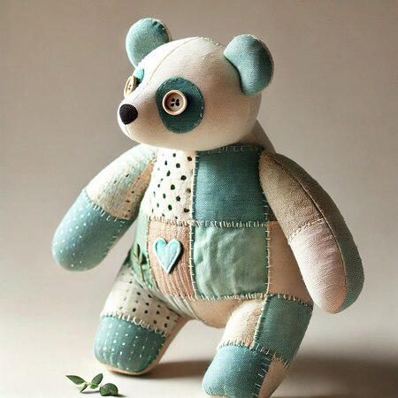 1 — according to the 3D model I have attached, make the same soft toy, but a patchwork bear with large stitches and button eyes, in a blue colour palette, in a sitting pose.