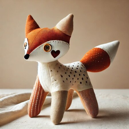 2 — according to the 3D model I have attached, make the same soft toy, but a patchwork style fox with large stitches and button eyes, in a red colour palette.