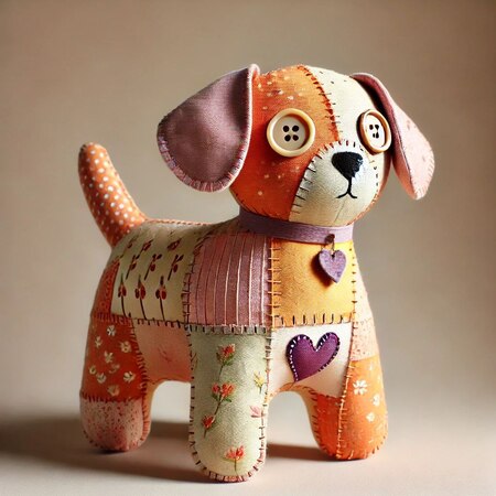 1 — according to the 3D model I attached, make a patchwork style soft dog toy with large stitches and button eyes.